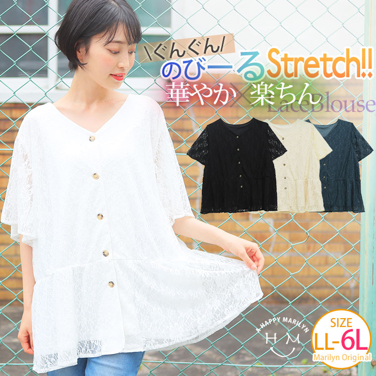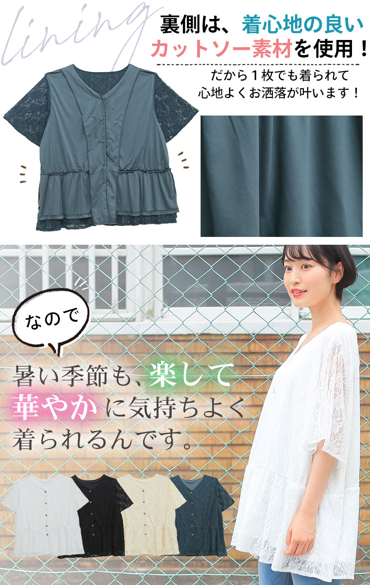 オリジナル シャツ トップス LL 3L 4L 5L 6L 夏 夏物 夏服 夏用 ぽっちゃり ゆったり お腹 二の腕カバー かわいい おしゃれ カジュアル ナチュラル きれいめ 上品 ガーリー フレア袖 レース ブラウス