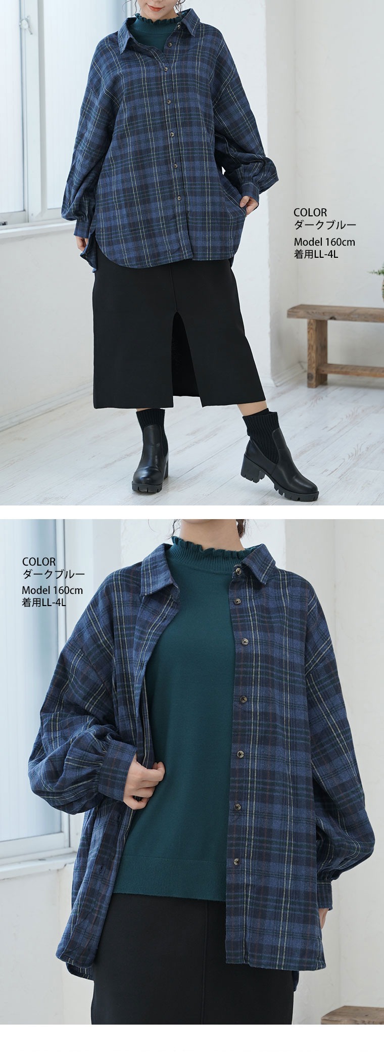 4. 大きいサイズ 新色追加!! フランネルチェック ボリューム袖 シャツ