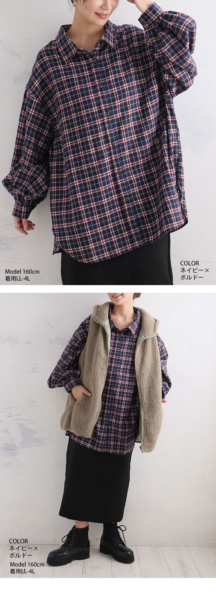 ブラウス チェック 起毛 ネルシャツ LL 3L 4L 5L 6L 7L 8L 秋 秋物 秋服 冬 冬物 冬服 ぽっちゃり ゆったり かわいい カジュアル 新色追加!! フランネルチェック ボリューム袖 シャツ