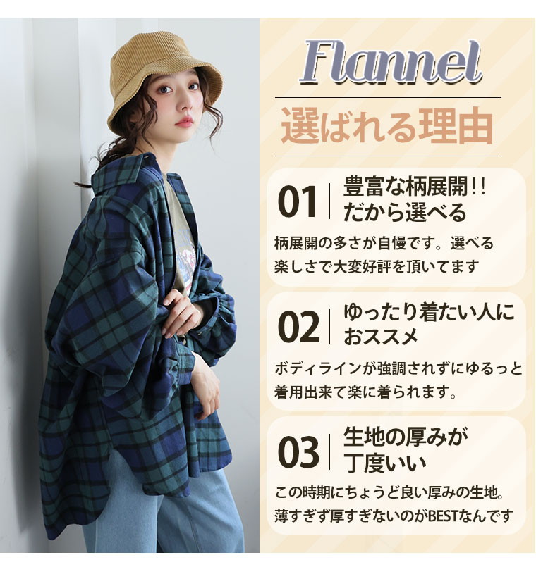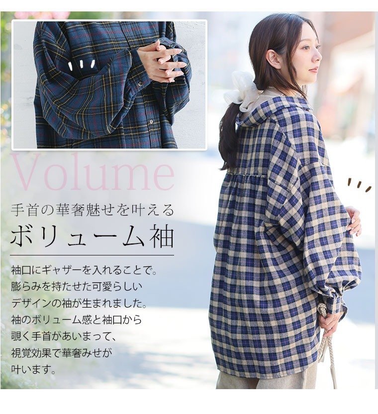 可愛く二の腕をまるっとカバーボリューム袖の定番フランネルチェックシャツ