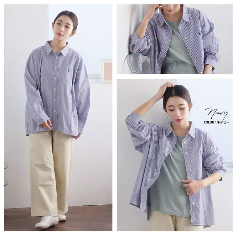 4. 大きいサイズ ハピにゃん刺繍・颯爽と春めく ゆるサイズの カジュアル シャツ
