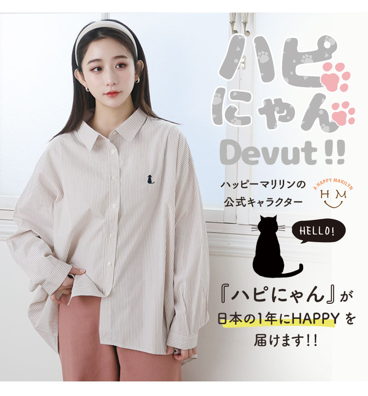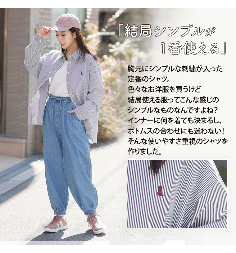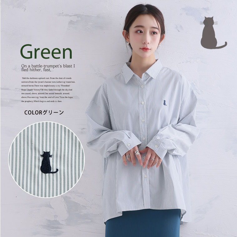 大きいサイズ ハピにゃん刺繍・颯爽と春めく ゆるサイズの カジュアル シャツ