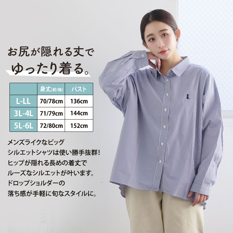 トップス LL 3L 4L 5L 6L 長袖 春 春物 春服 夏 夏物 夏服 ぽっちゃり ゆったり プラスサイズ かわいい カジュアル お尻 二の腕カバー ハピにゃん刺繍・颯爽と春めく ゆるサイズの カジュアル シャツ