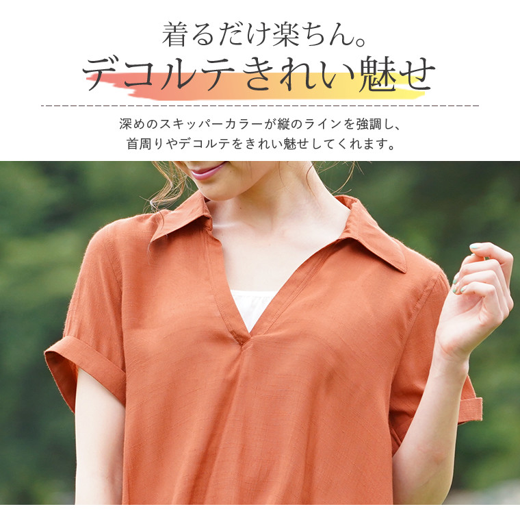 涼感漂うスラブ素材でゆったり楽ちんなのに体型カバーもこなす。大人顔スキッパー