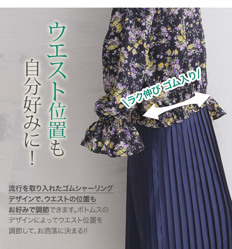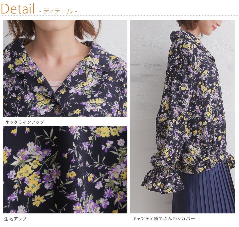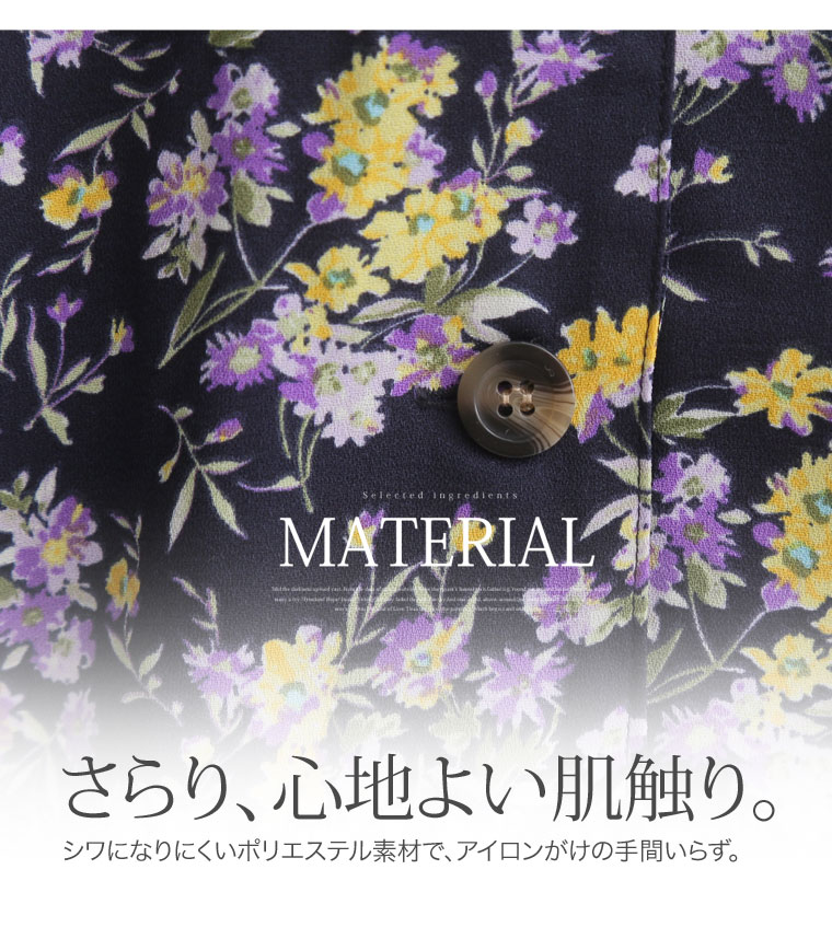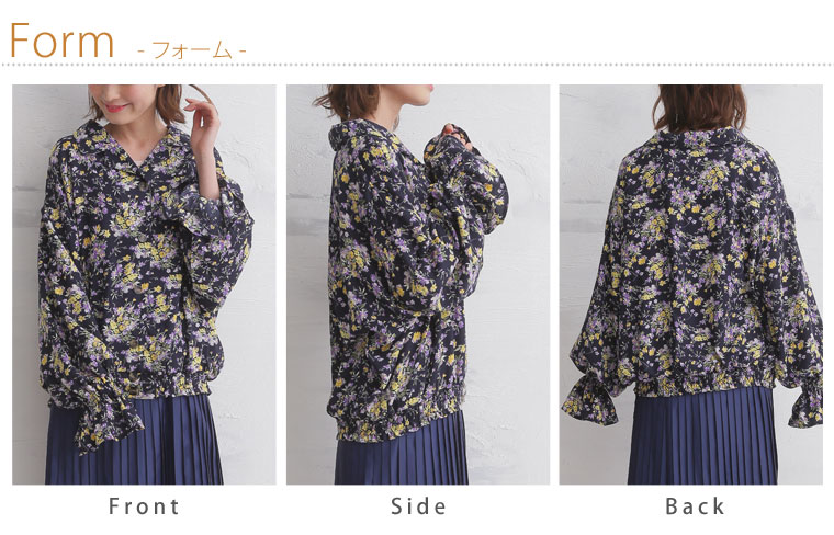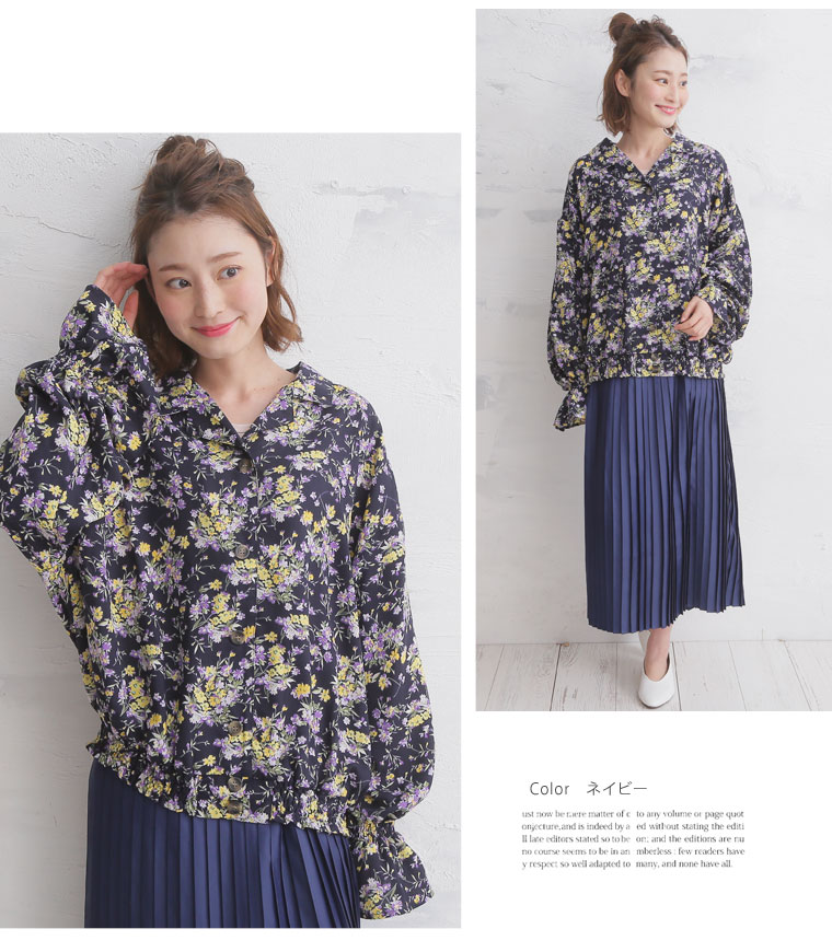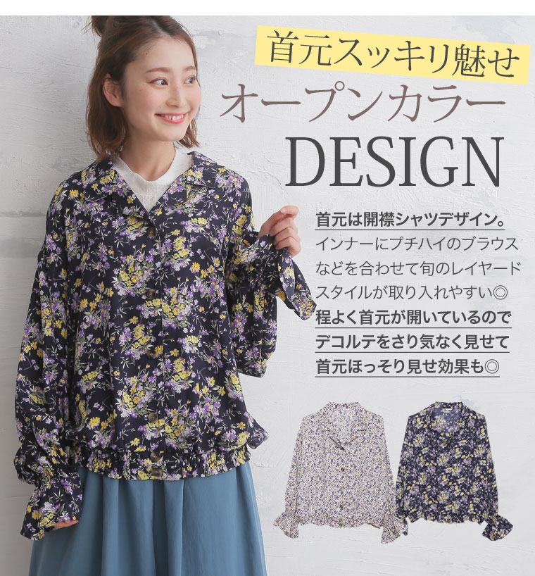 華やかな花柄デザインで季節感たっぷりに。シャーリングブラウス