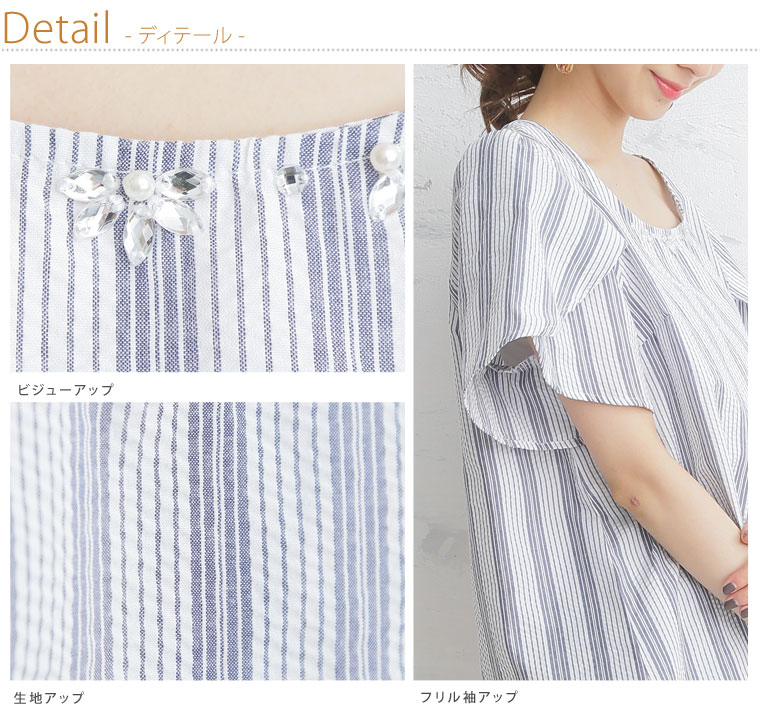 ネックラインを飾るビジューがアクセント。フリル袖ブラウス