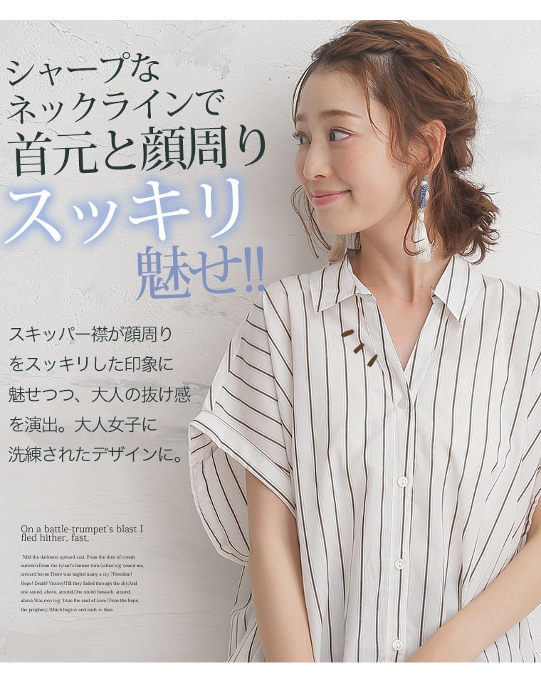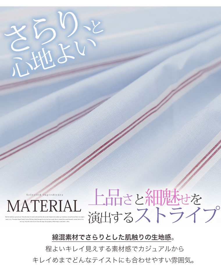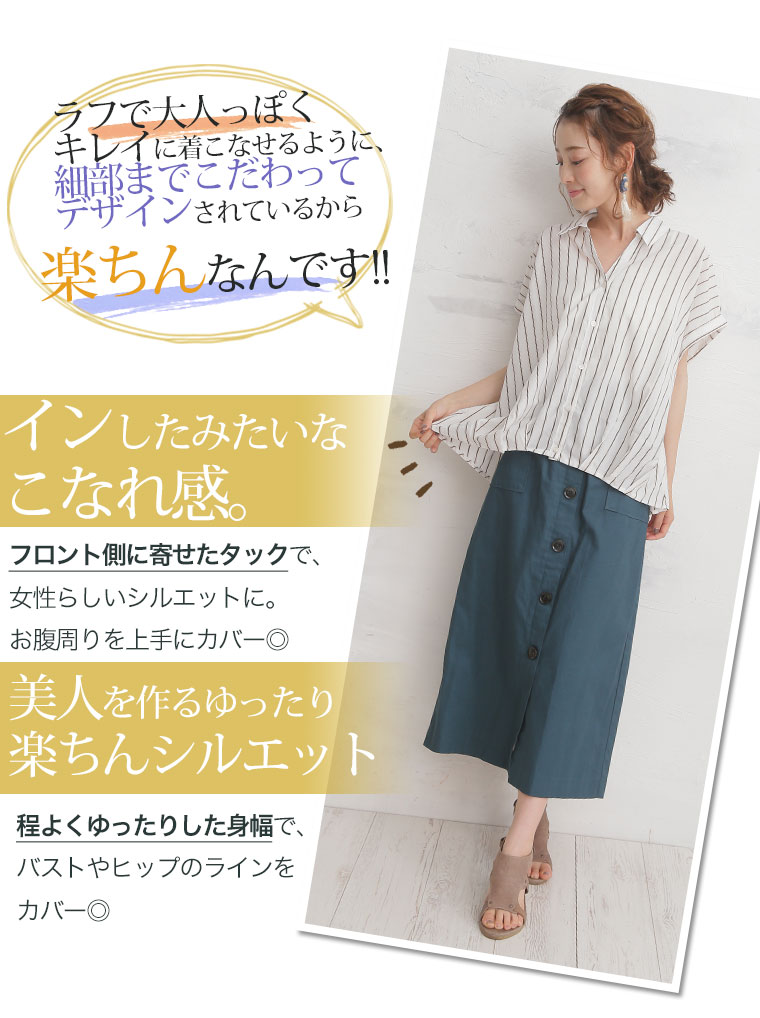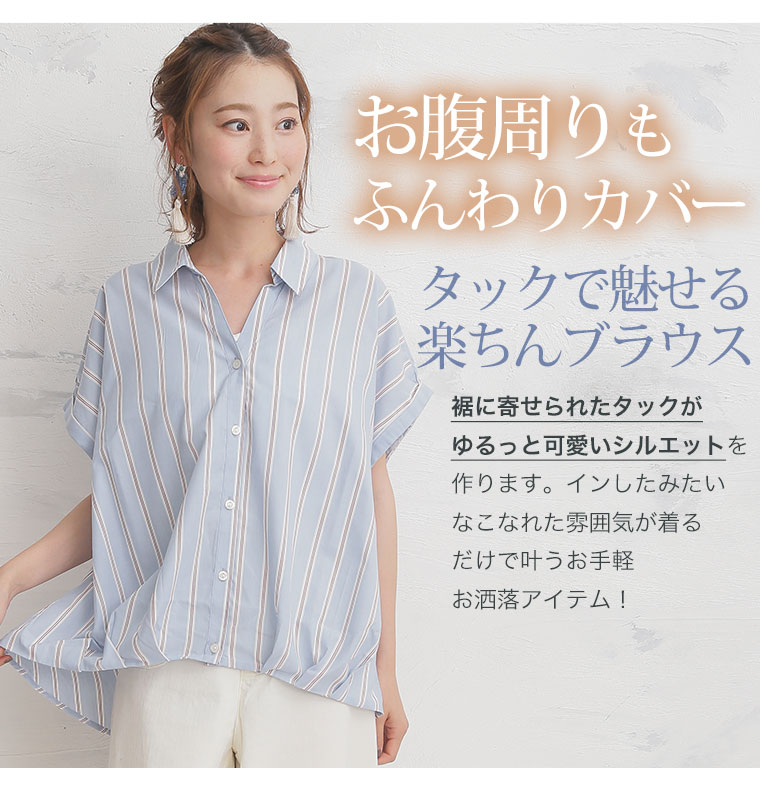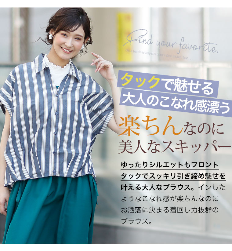 すっきり着痩せ効果のあるストライプ前開きフロントタックスキッパーシャツ