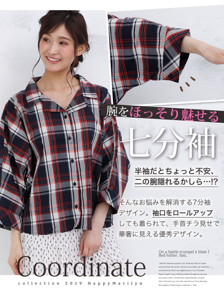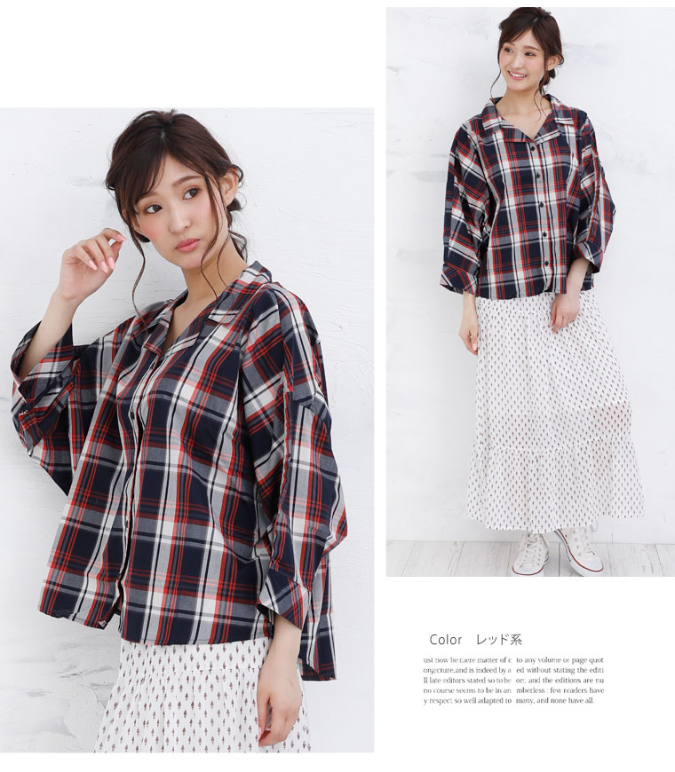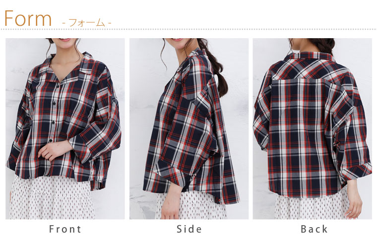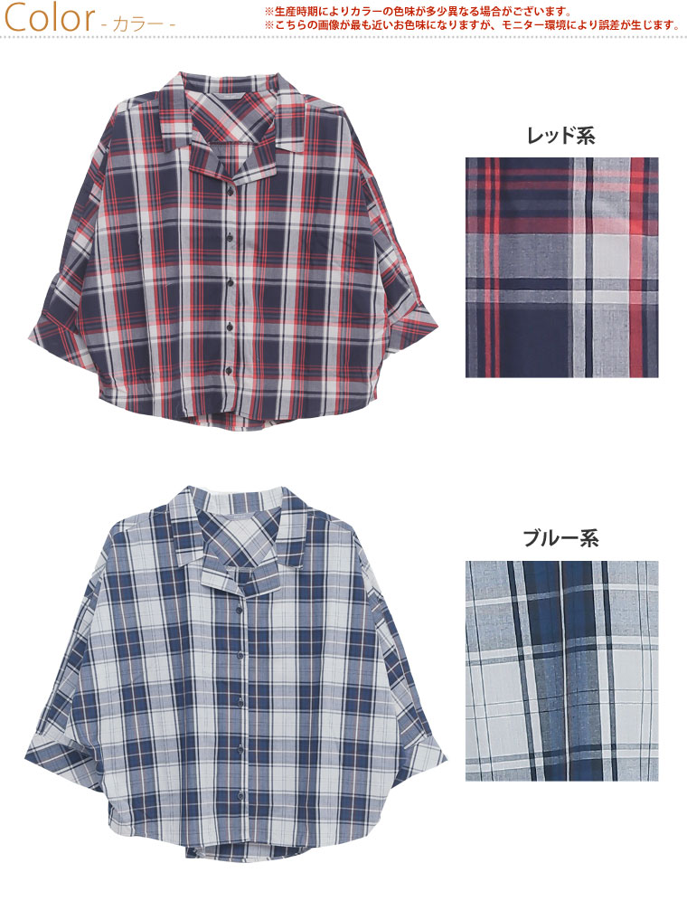 カジュアルなゆったりデザインで大人可愛く7分袖チェックシャツ