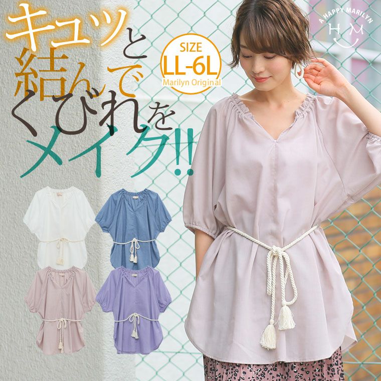 オリジナル トップス カットソー LL 3L 4L 5L 6L 秋 秋物 秋冬 ぽっちゃり ゆったり かわいい おしゃれ カジュアル お腹 二の腕カバー ベルト付き キーネック 五分袖 ボリューム ブラウス【メール便可1】 | 大きいサイズの通販ならハッピーマリリン
