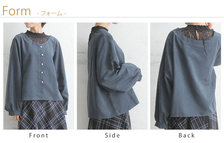 レース切替えで上品なブラウスでした。ジャストでしたが首周りはゆったり、腕周りもゆったりとしていました。丈は、短めで腰まででした。