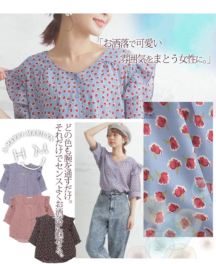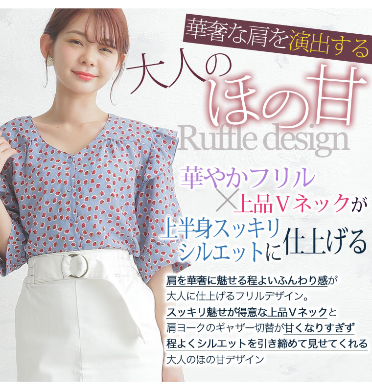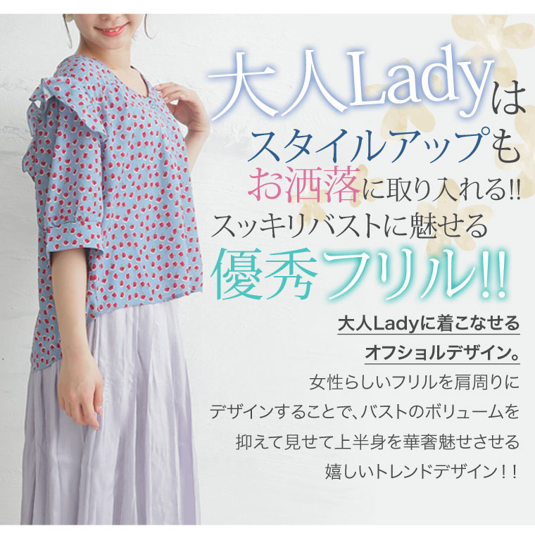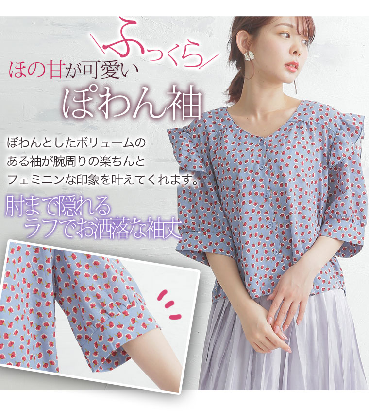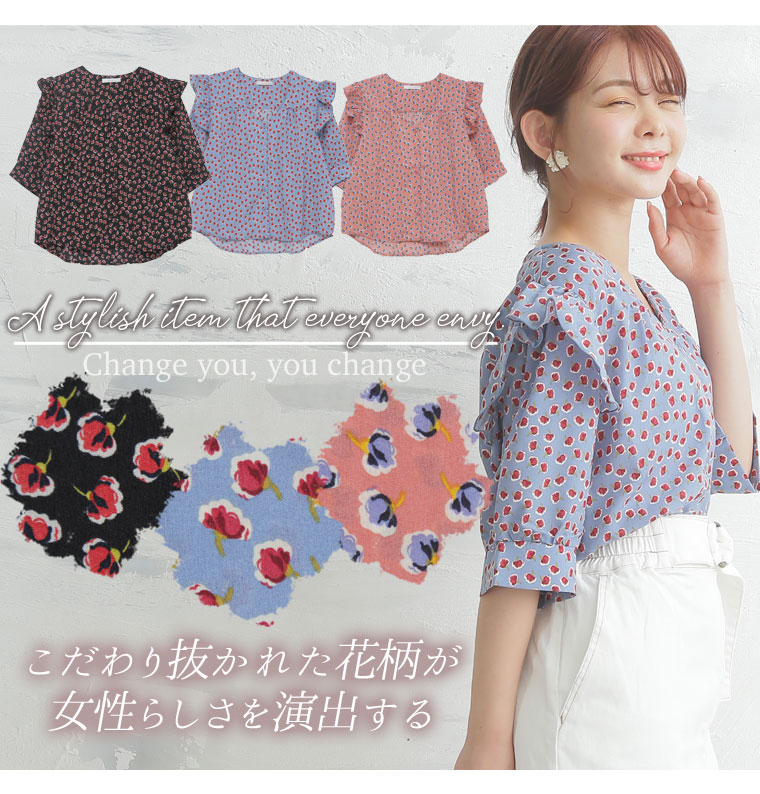 首元をスッキリ見せる♪デシン中花柄 肩フリル五分袖ブラウス