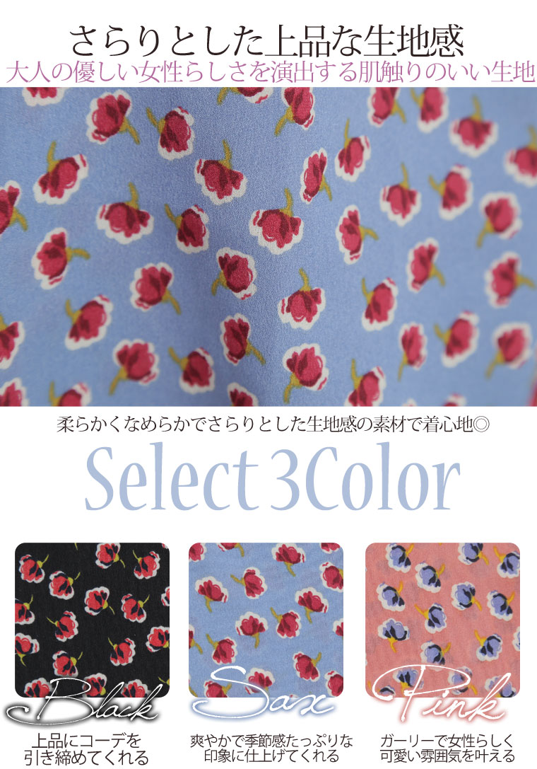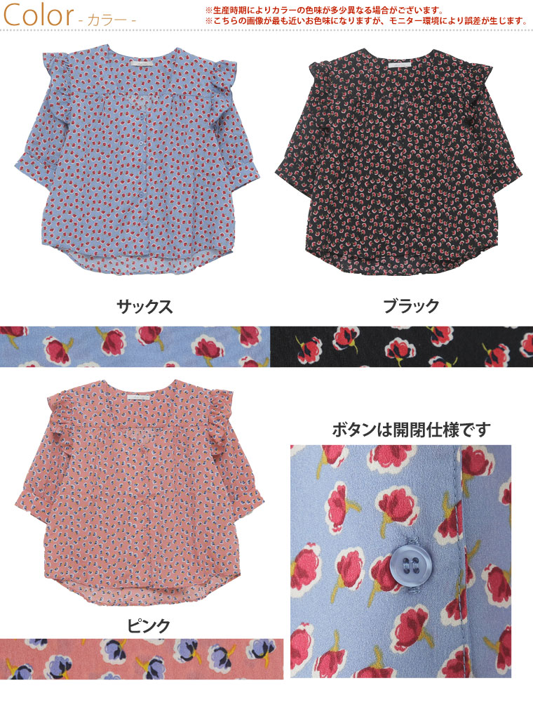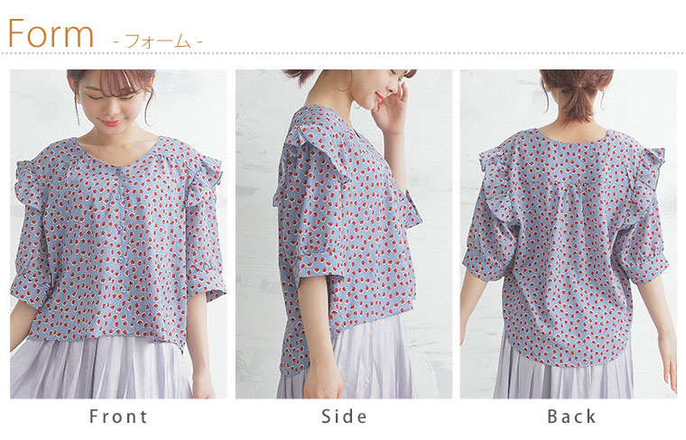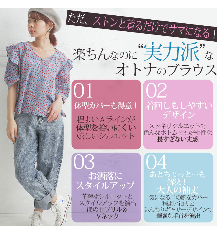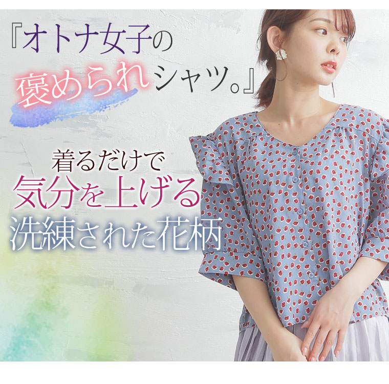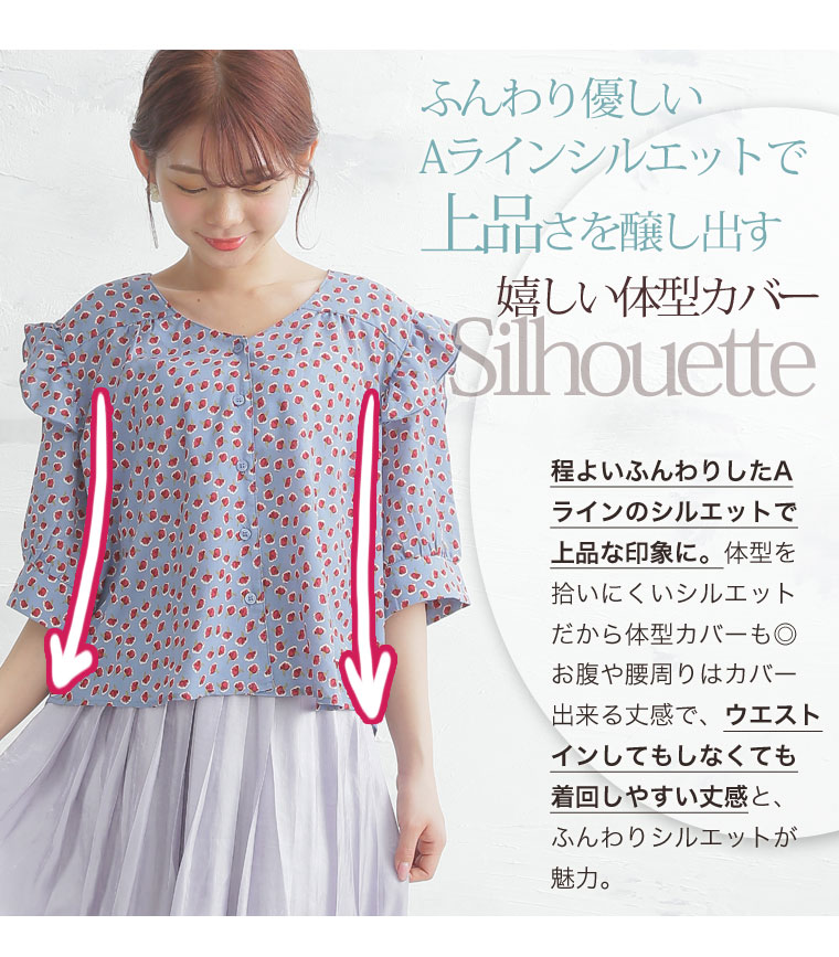 首元をスッキリ見せる♪デシン中花柄 肩フリル五分袖ブラウス