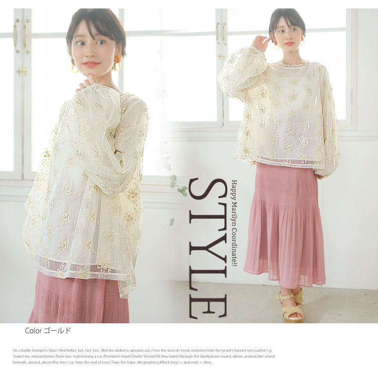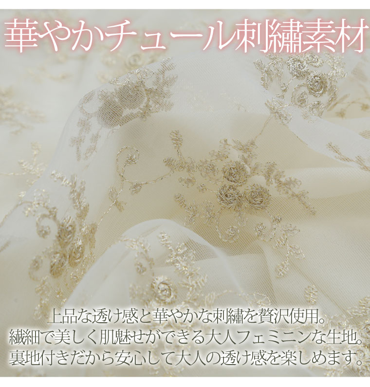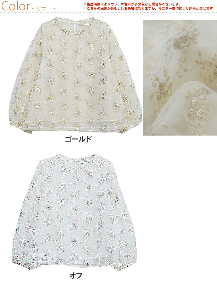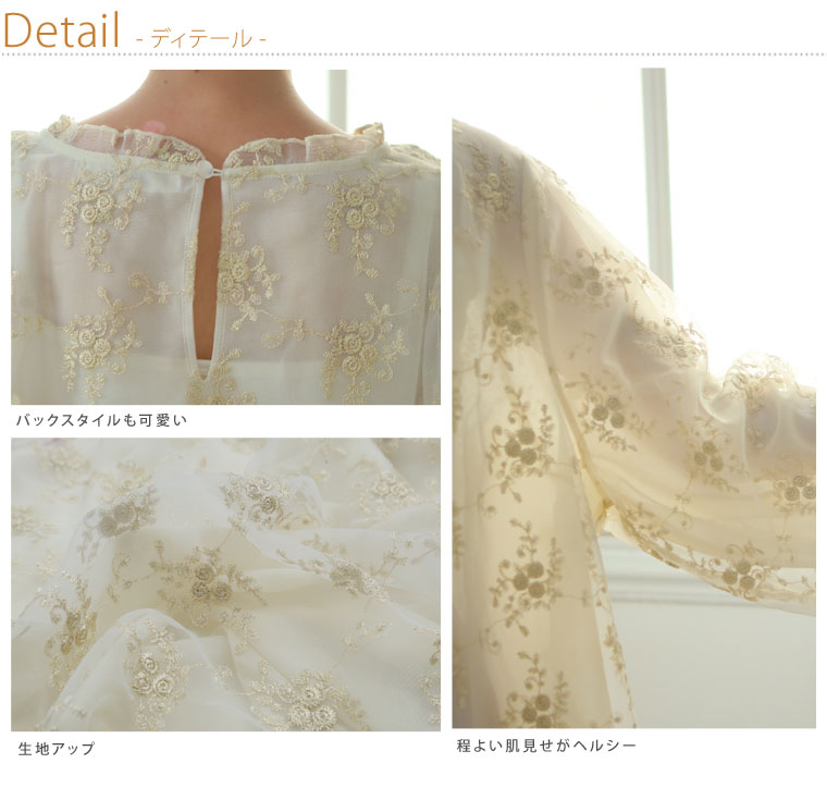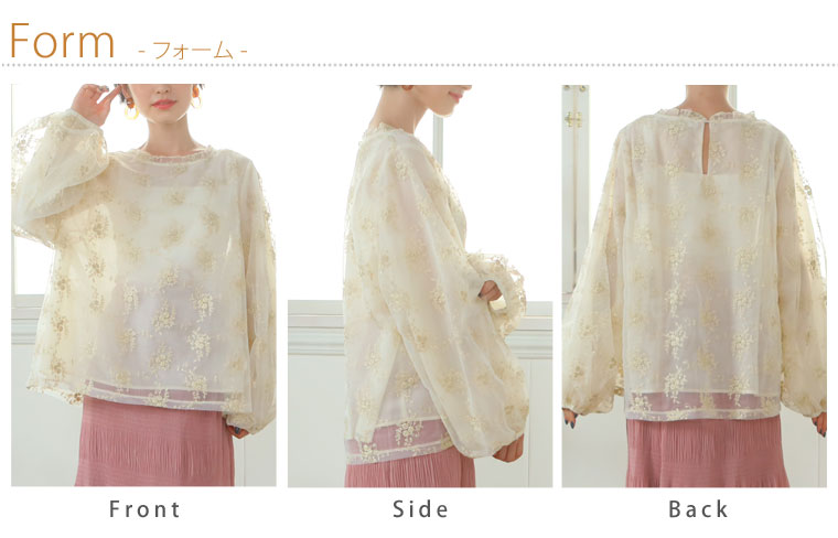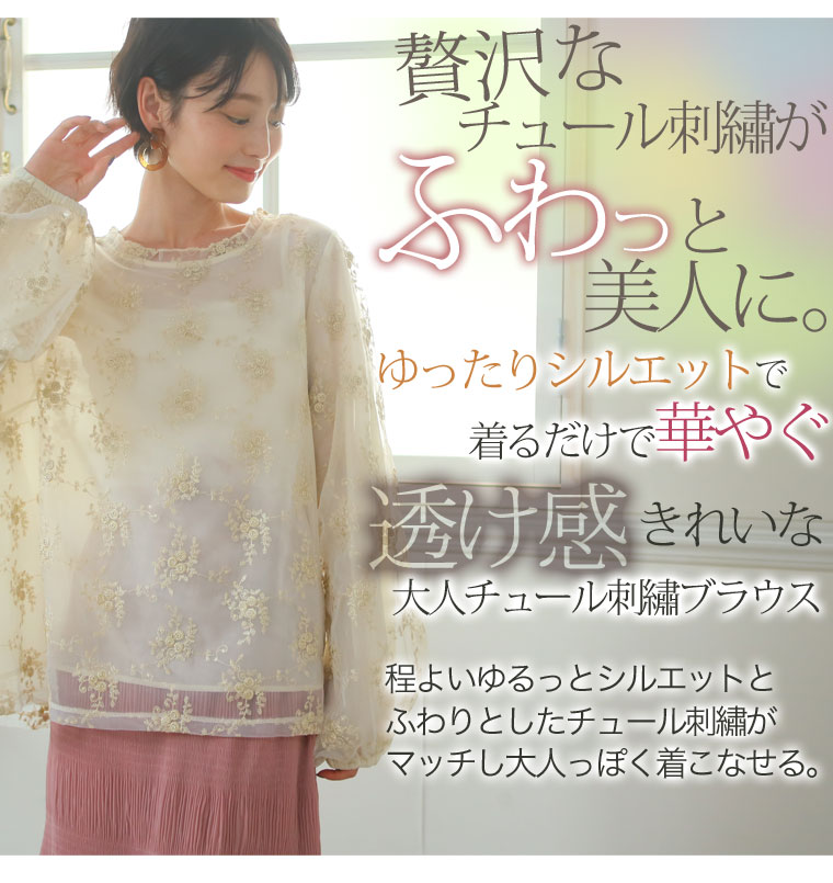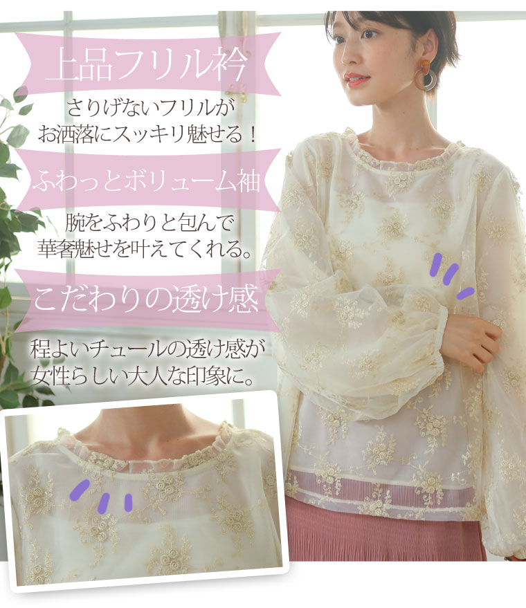 華やか上品 チュール刺繍マオカラーボリューム袖ブラウス
