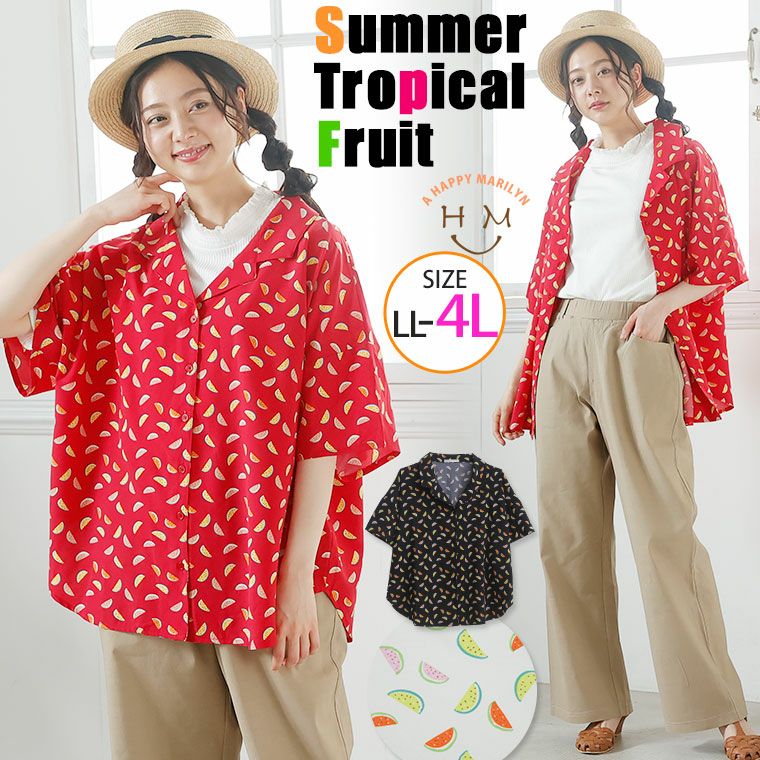 スイカ柄で夏の装い開襟シャツ