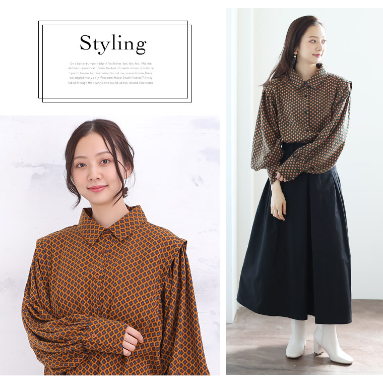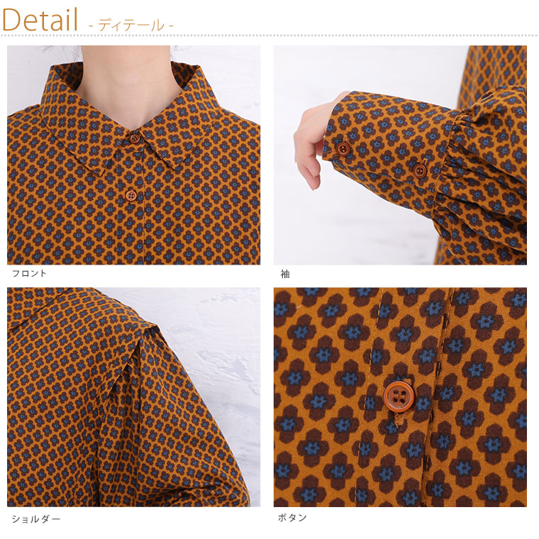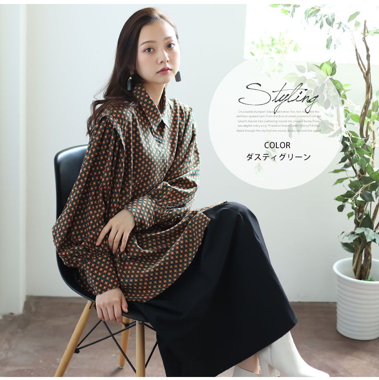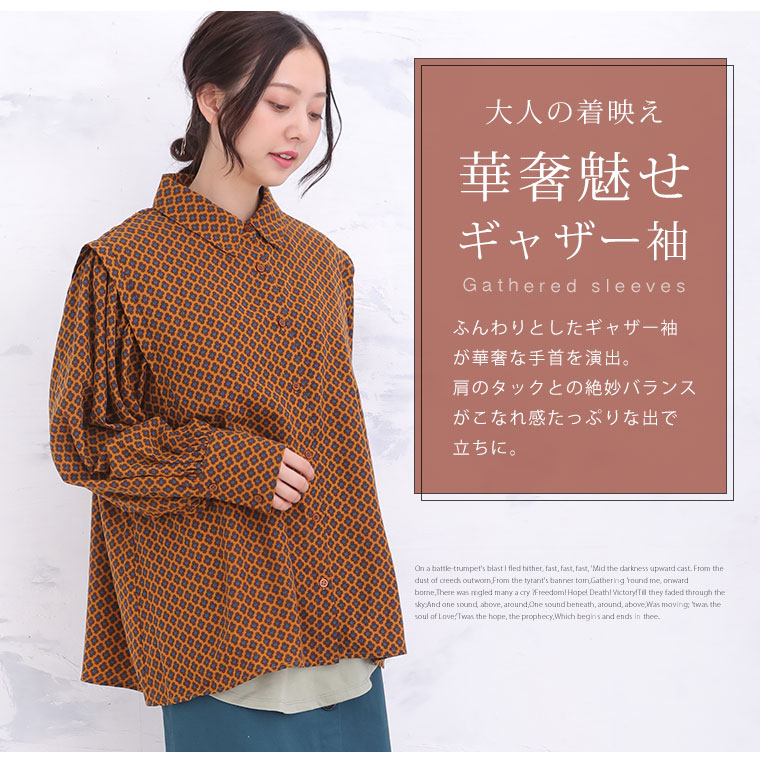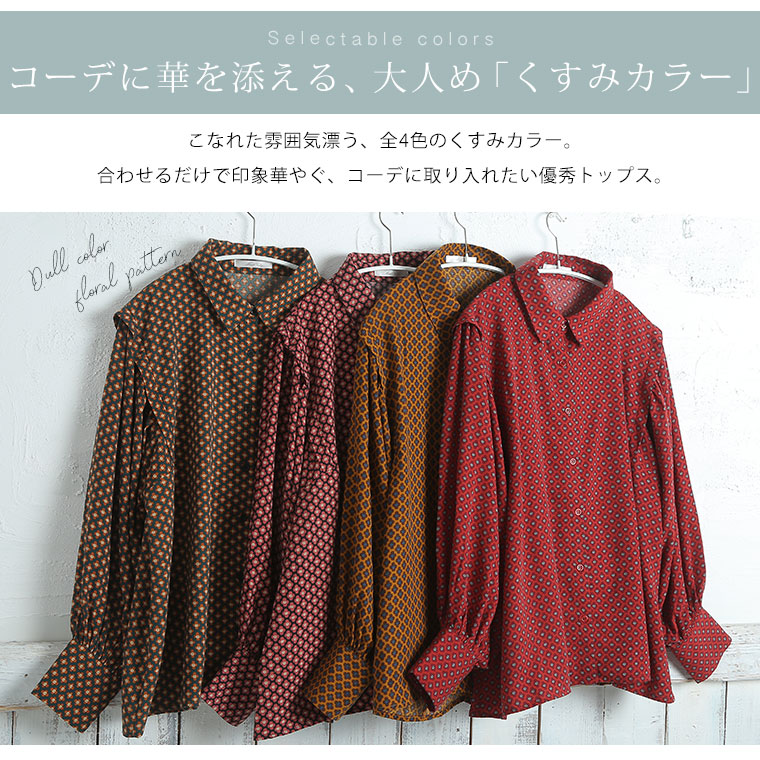 くすみカラーの花柄でレトロに魅せるギャザー袖ブラウス