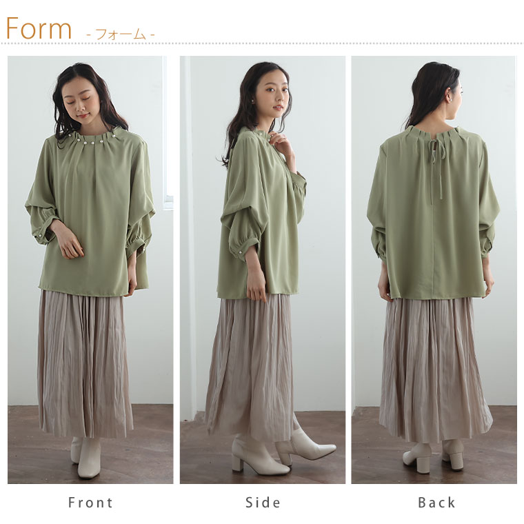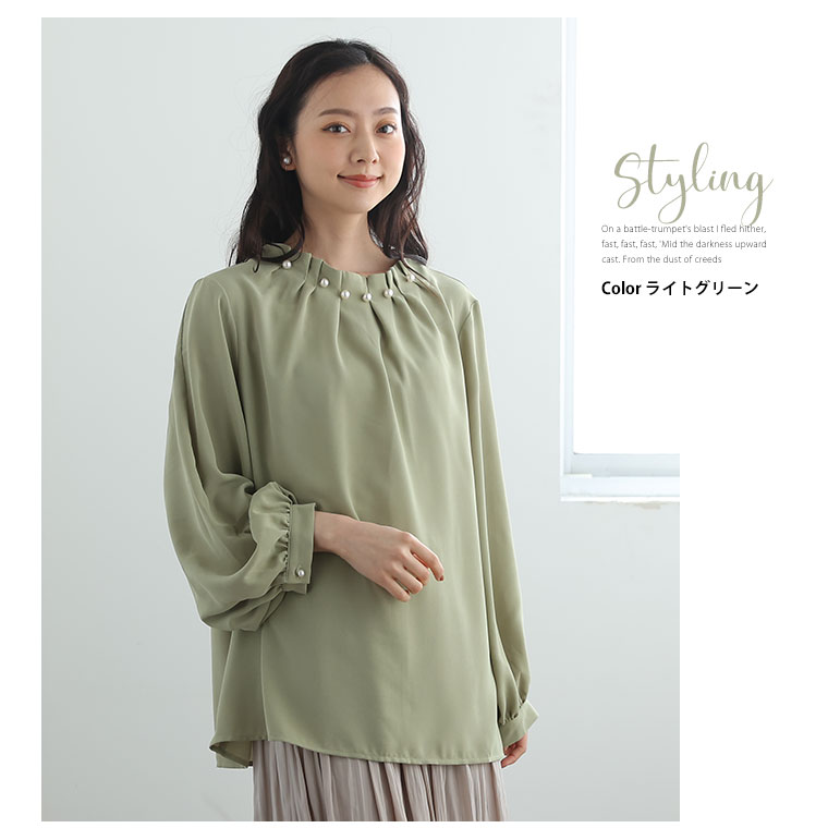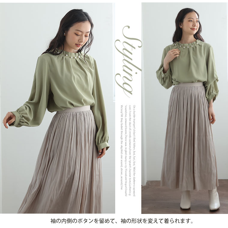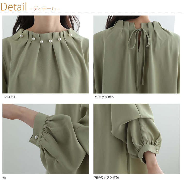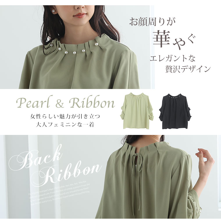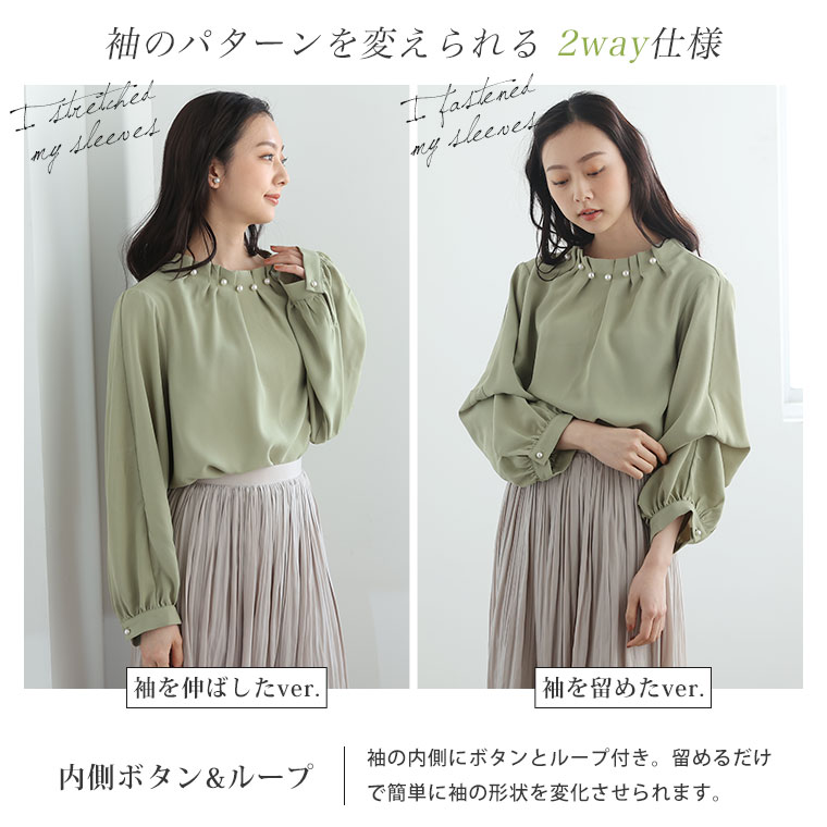 襟元パール使いでフェミニンにかわいくコーデできる2Way袖ブラウス