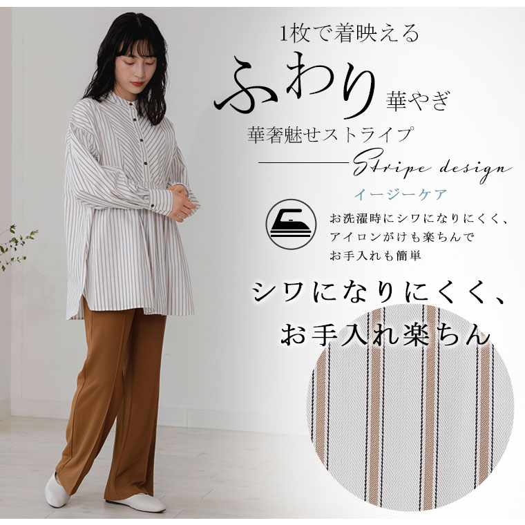 ブラウス トップス LL 3L 4L 5L 6L 秋 秋物 秋冬 ぽっちゃり ゆったり かわいい おしゃれ カジュアル ナチュラル プラスサイズ 【LUMFORLE produced by My:nia】ストライプ袖 ボリュームデザイン シャツ