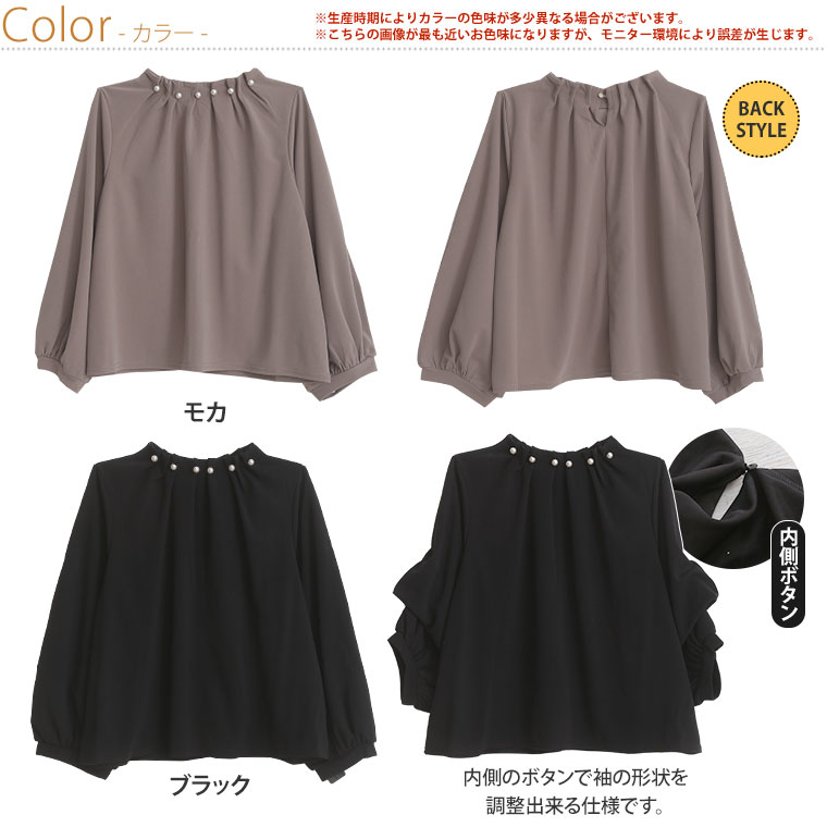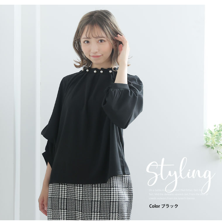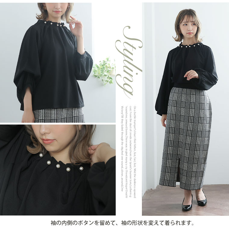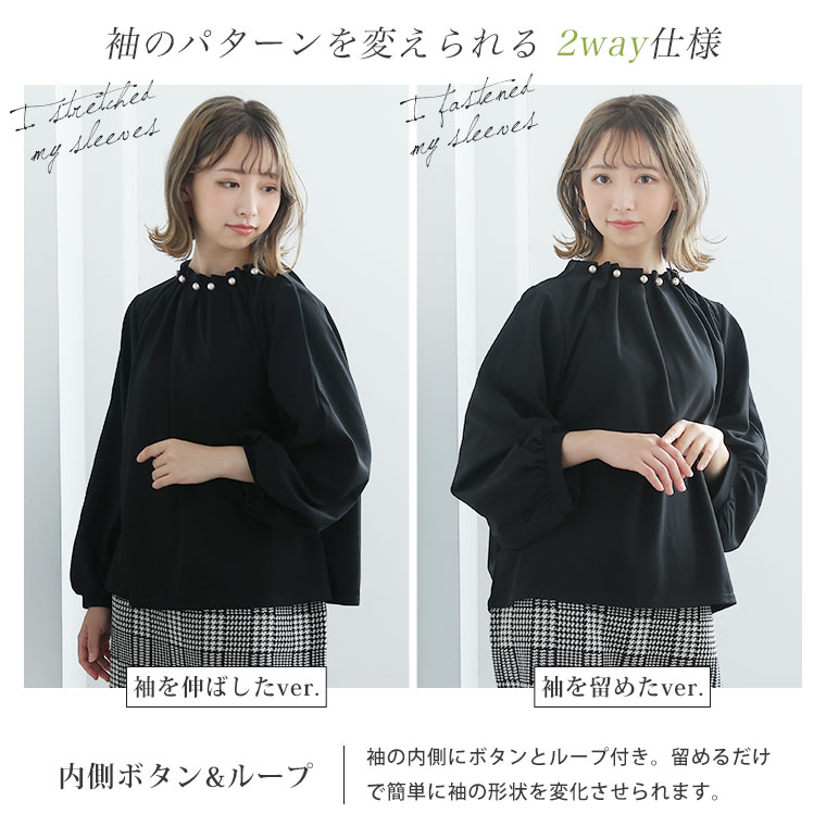 襟元パール使いでフェミニンにかわいくコーデできる2Way袖ブラウス
