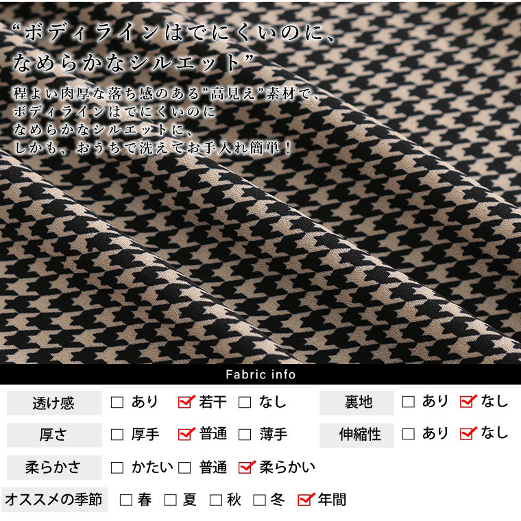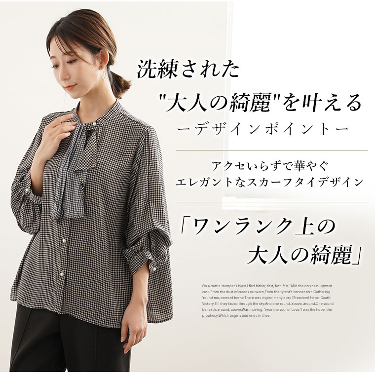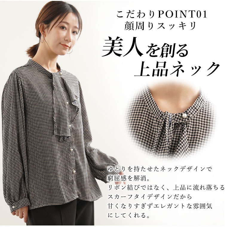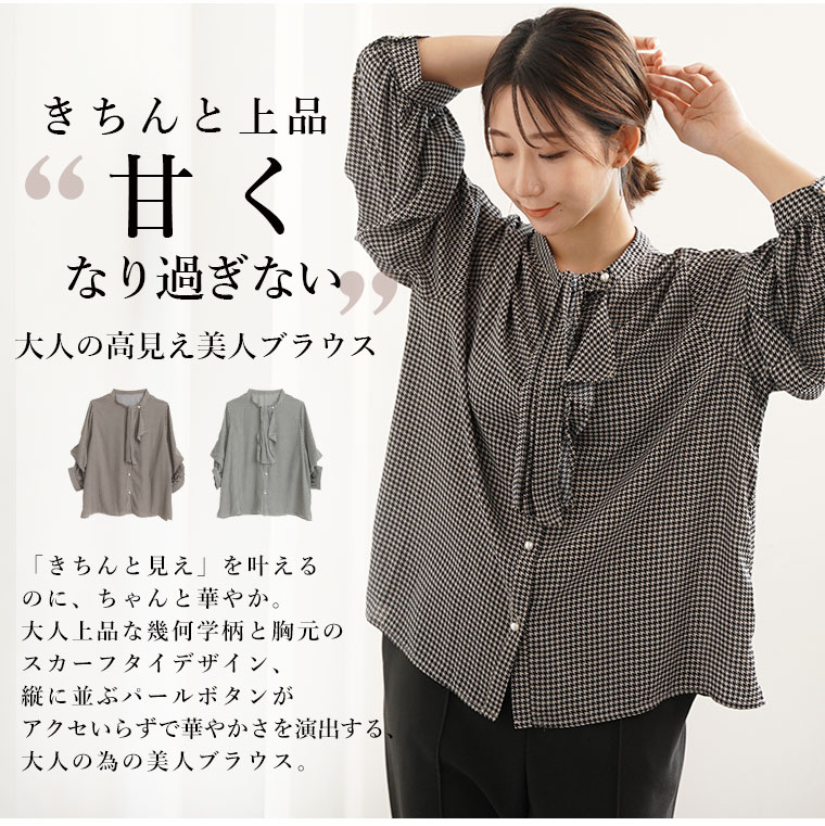 大人上品な幾何学柄と胸元のスカーフタイデザイン、縦に並ぶパールボタン