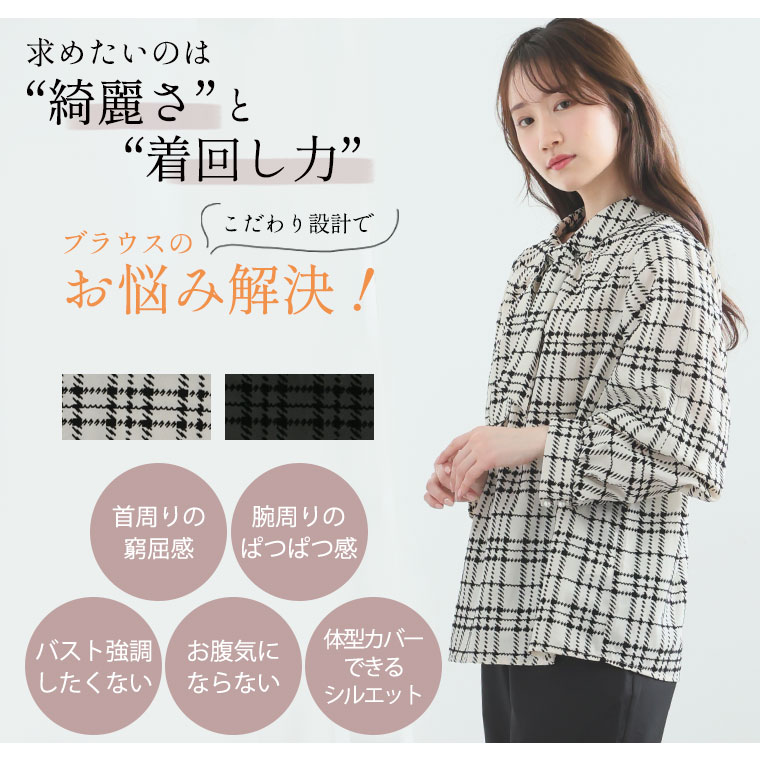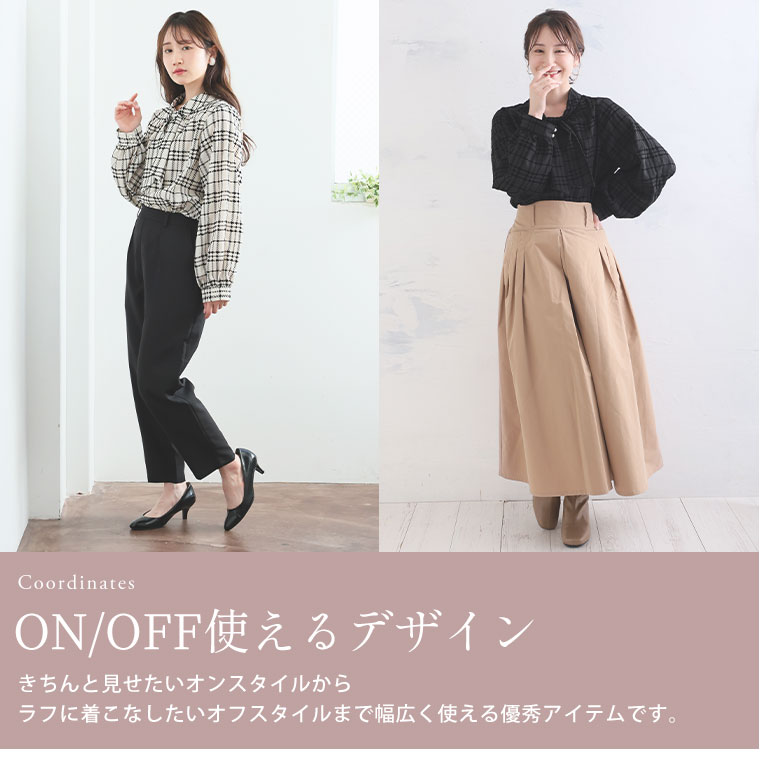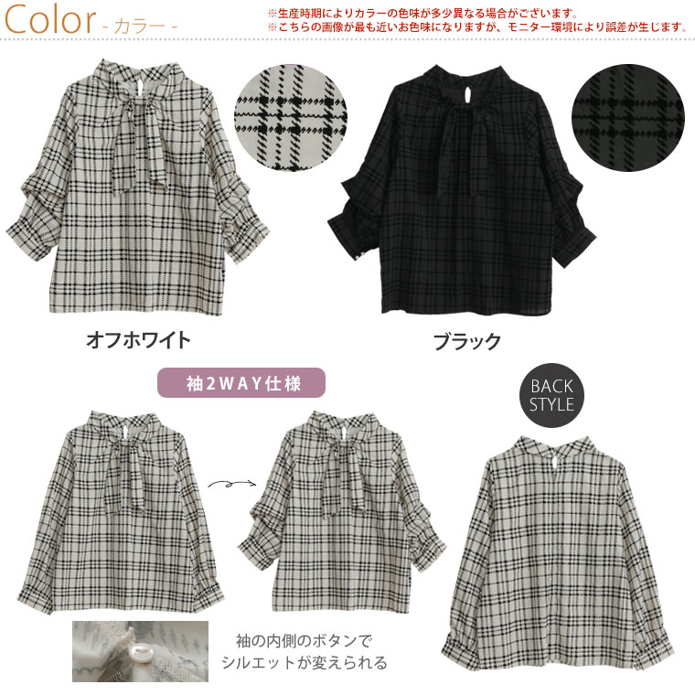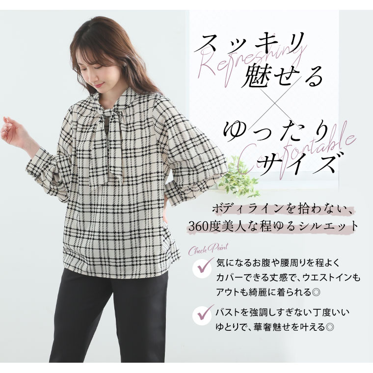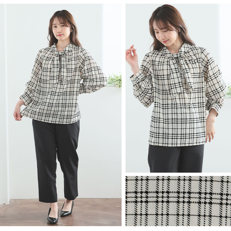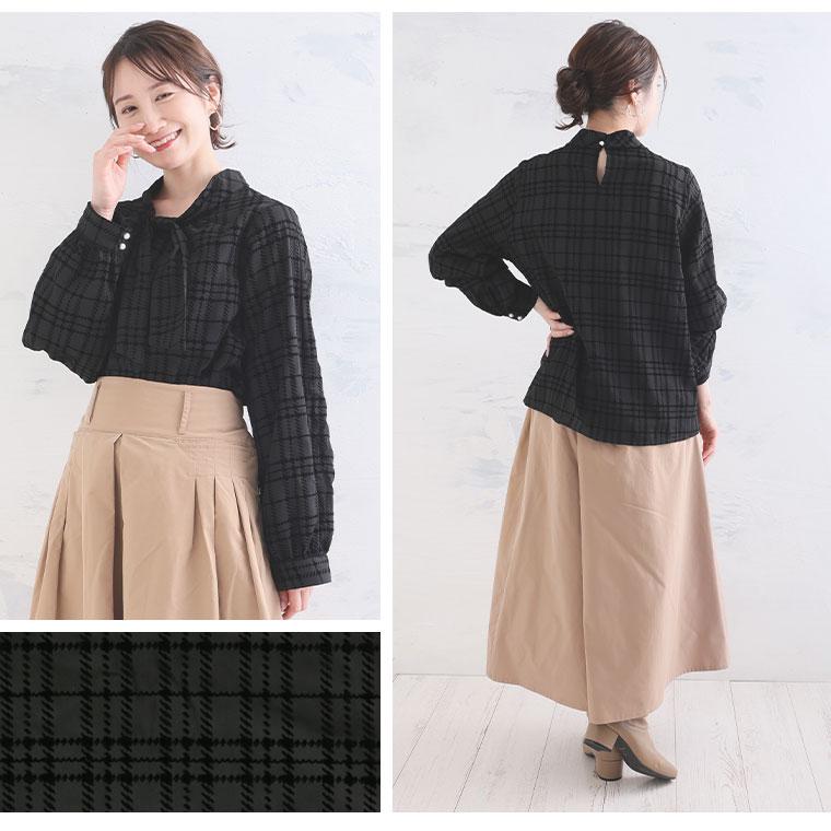 好みでシルエットが変えられる 華やぎ上品2WAYチェックフロッキーブラウス