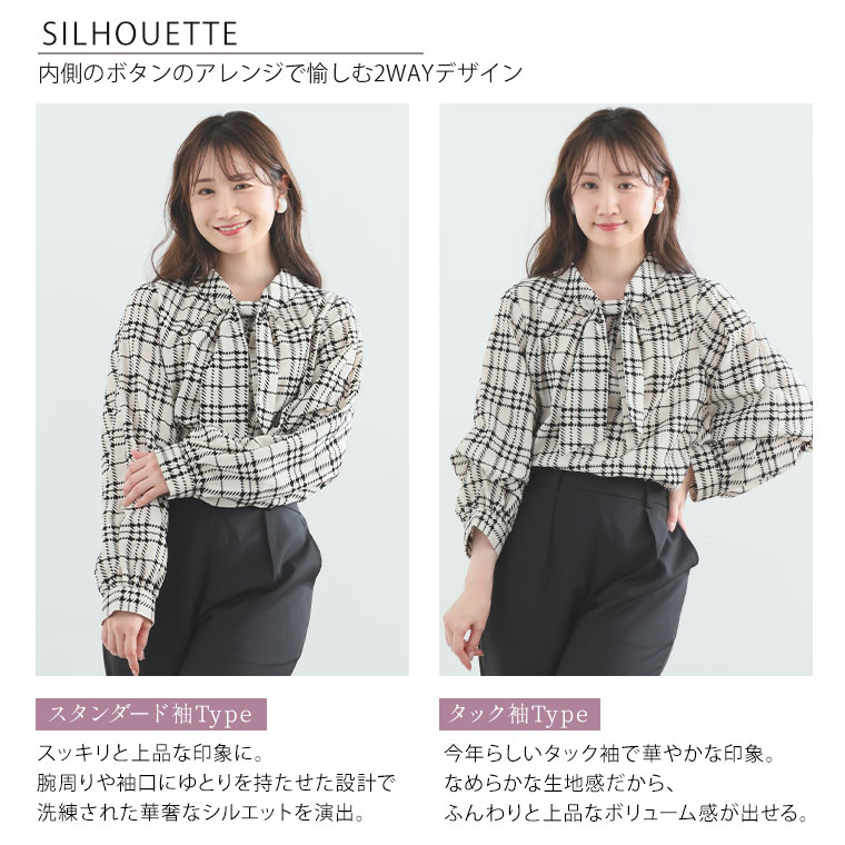 袖の内側ボタンで袖のシルエットが変わる リボン付きの上品デザイン