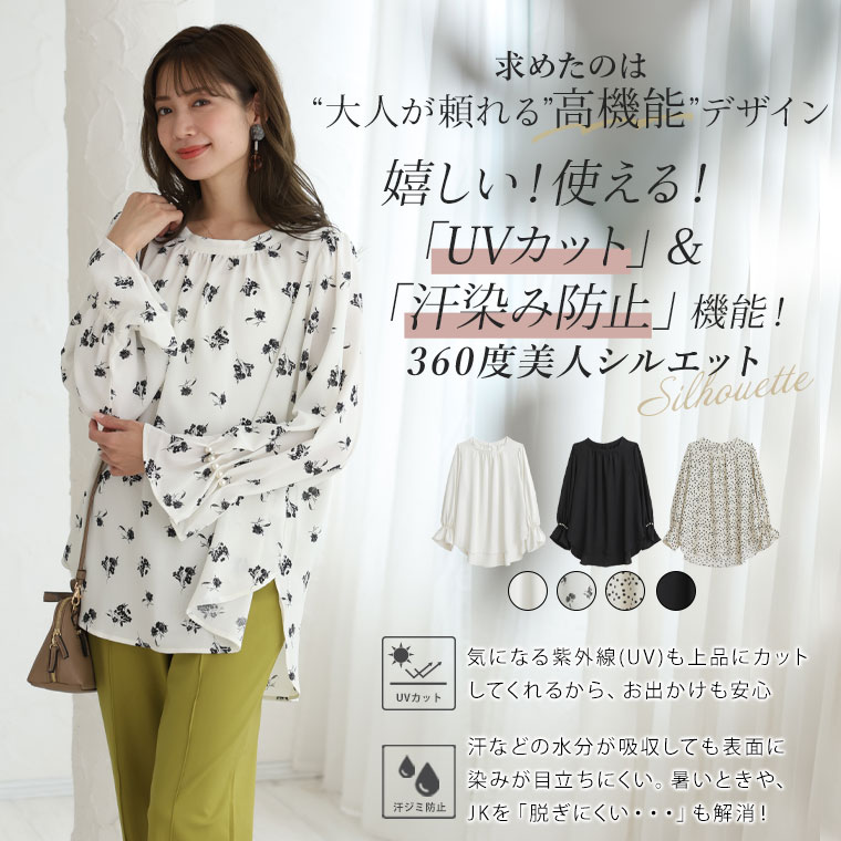 大きいサイズ Rin お悩み解消! UVカット 汗染み防止 ポーラ袖 ギャザーブラウス オフィス 大人 着やせ 体型カバー ビジネス 通勤 ママ セレモニー uv 【セレモニー】