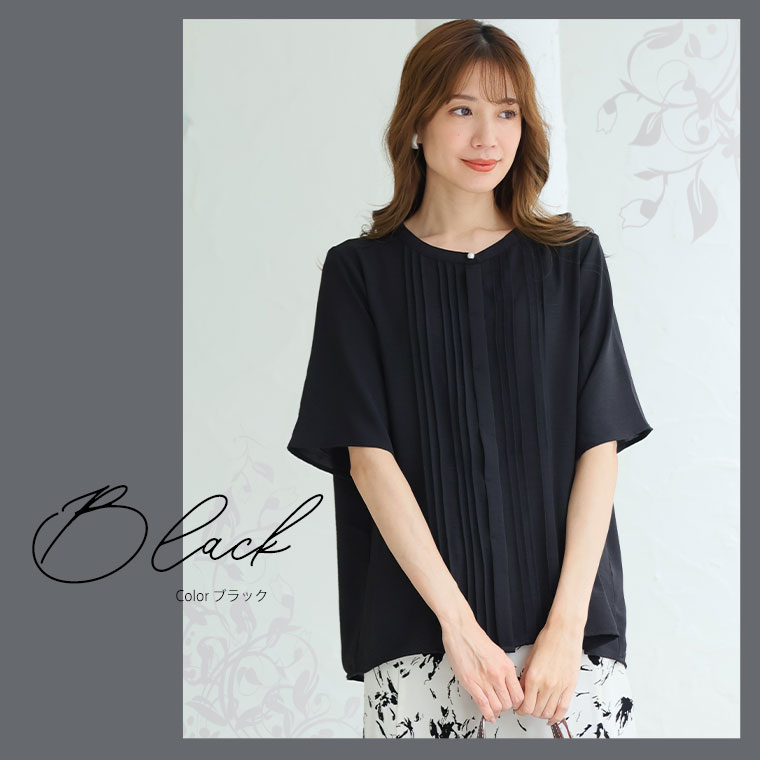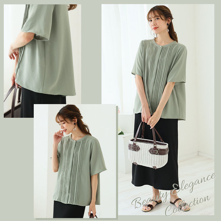 6. 大きいサイズ Rin 美人ポーラ素材 パール付 ピンタックブラウス オフィス 大人 着やせ 体型カバー ビジネス 通勤 ママ