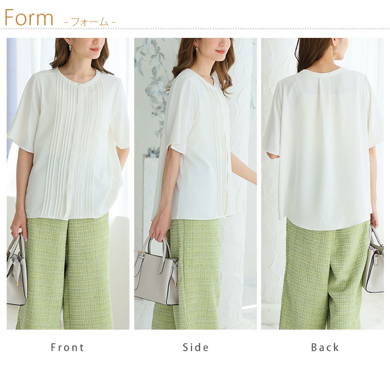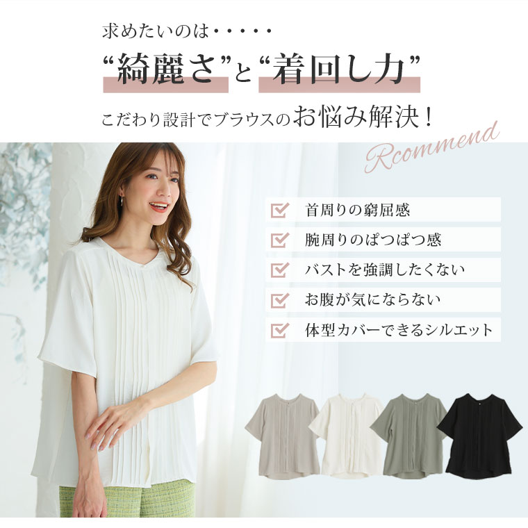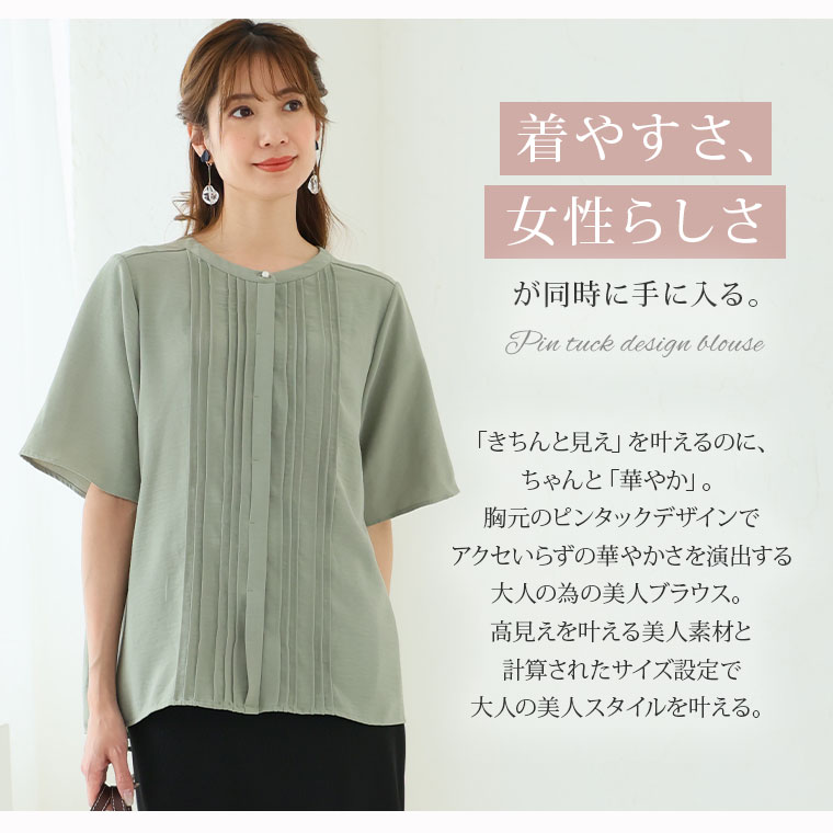 4. 大きいサイズ Rin 美人ポーラ素材 パール付 ピンタックブラウス オフィス 大人 着やせ 体型カバー ビジネス 通勤 ママ