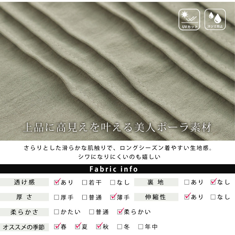 身長:151 購入サイズ:L-LL 着用感:肘あたりまで隠れるので、二の腕がしっかり隠れて安心です。 タックがキレイに入っていて生地もストンと落ちるので、見た目もすっきり着られます。 ストレッチ感は、なしです。 カラーについて:ブラックを購入。合わせやすいです。