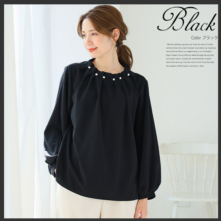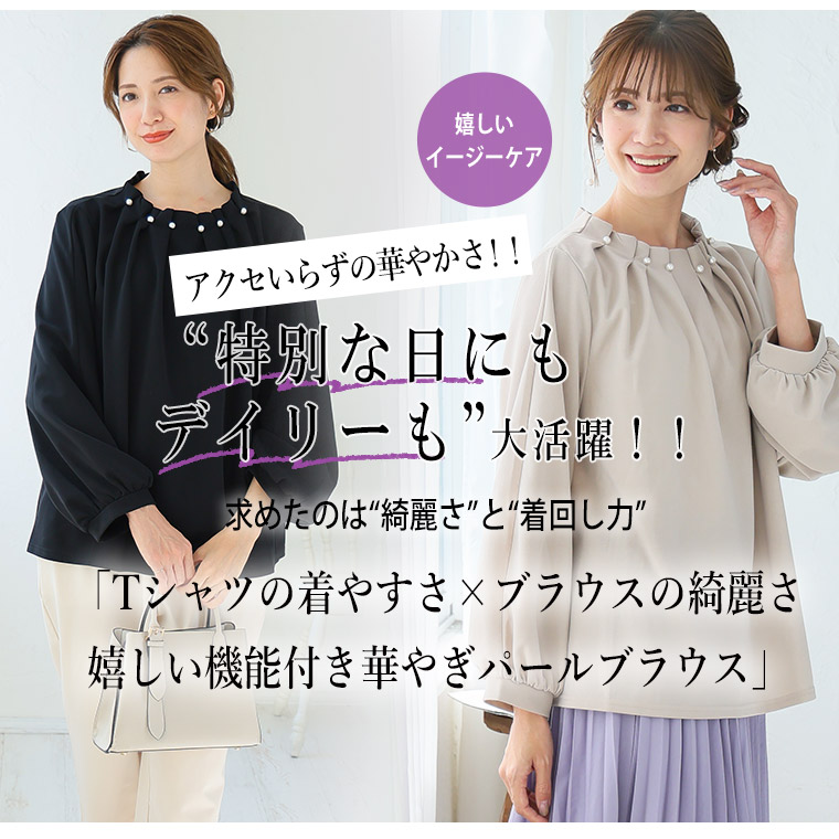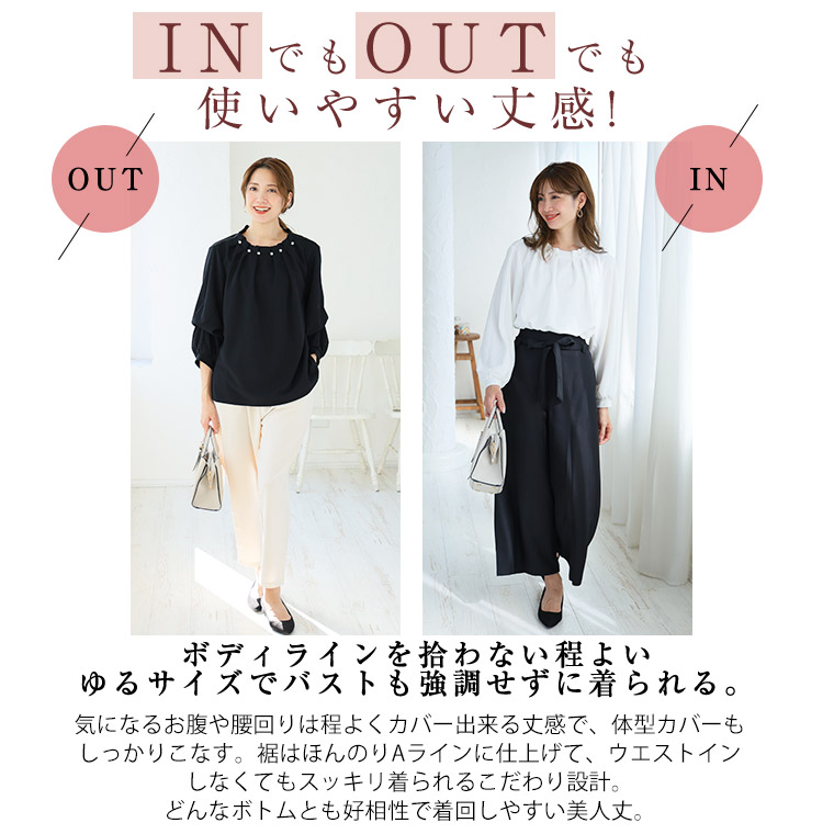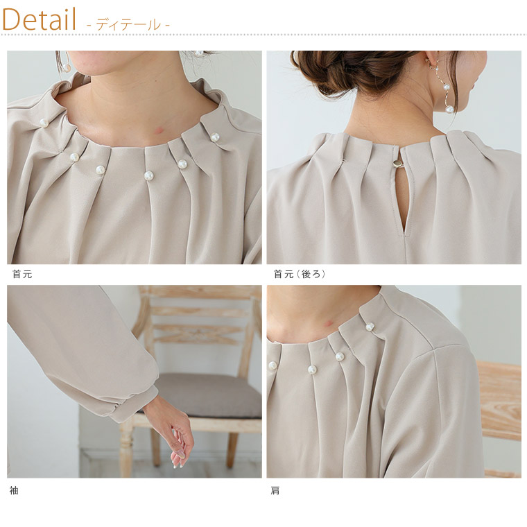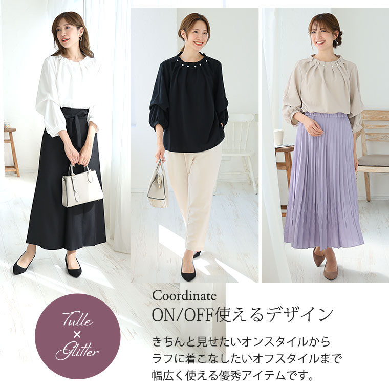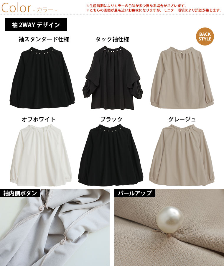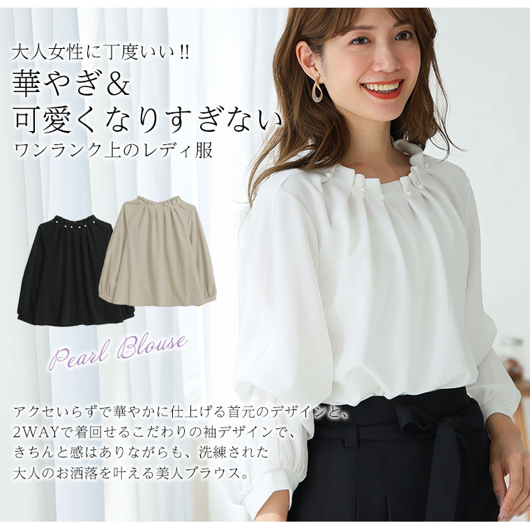 襟元パール使いでフェミニンにかわいくコーデできる2Way袖ブラウス