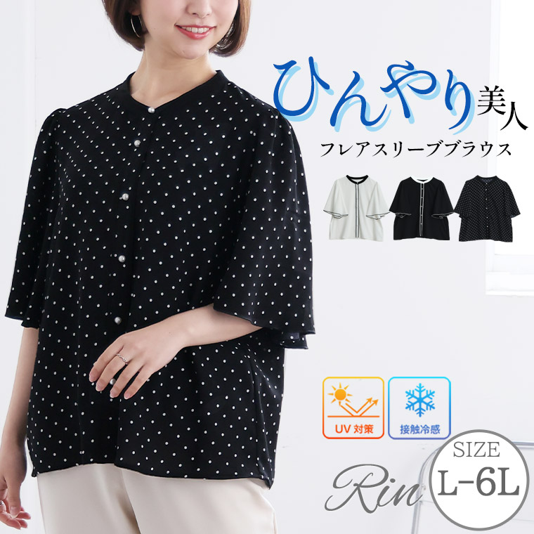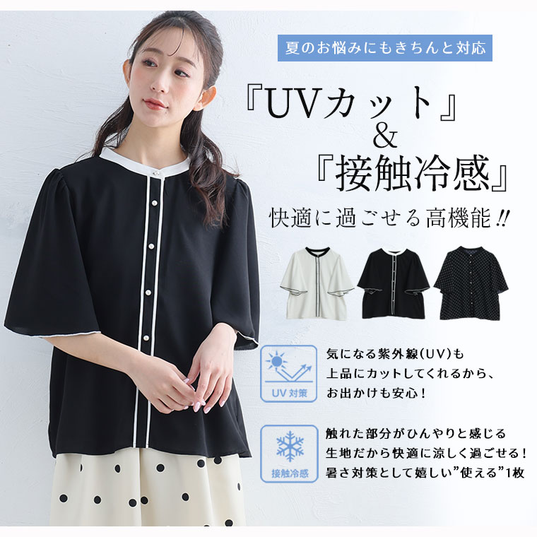 シャツ トップス LL 3L 4L 5L 6L 五分袖 接触冷感 UV 夏 夏物 夏服 夏用 ぽっちゃり ゆったり プラスサイズ かわいい おしゃれ カジュアル ナチュラル Rin 配色 フレア袖 ポーラ ブラウス