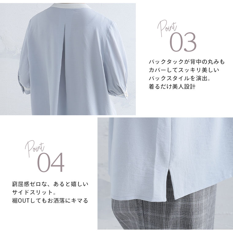 首元のボタンで、バンドカラーとスキッパーデザインに変えられる2waySTYLE