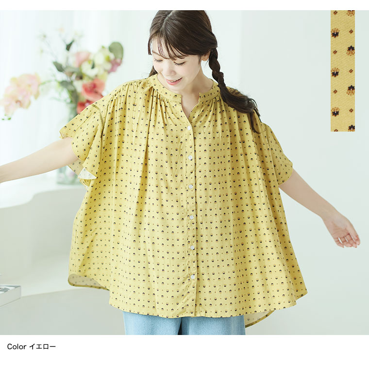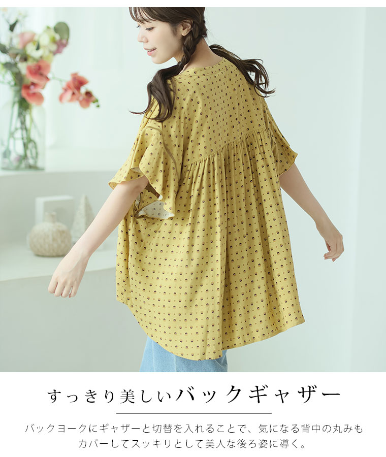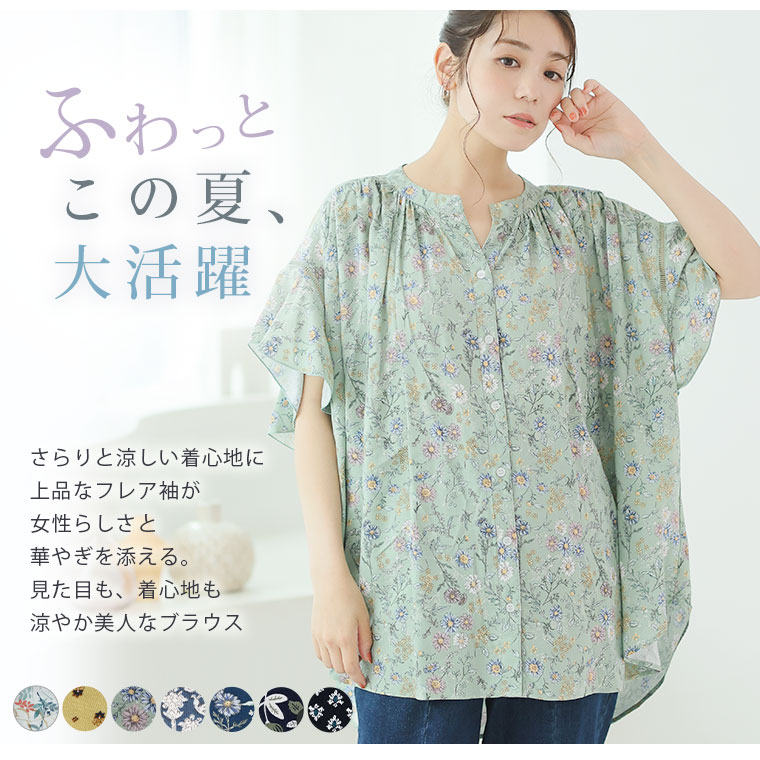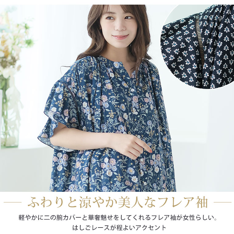 大人のためのはしごレース×フレア袖の華やかプリントシャツ