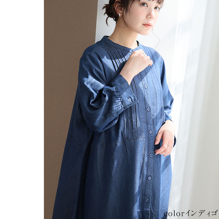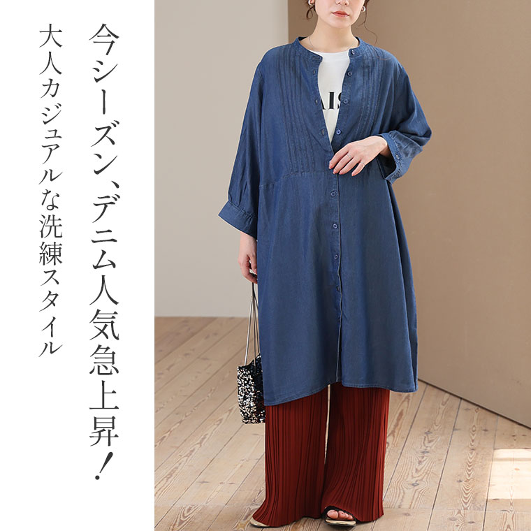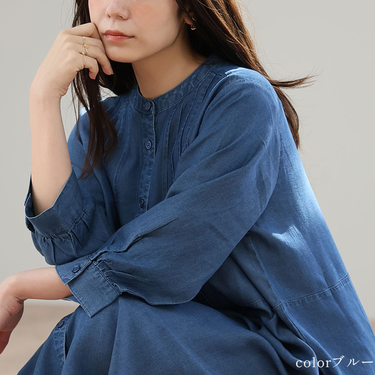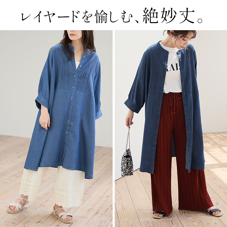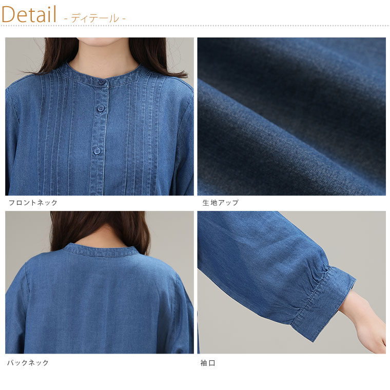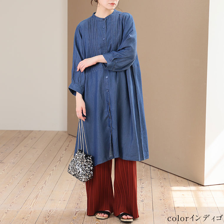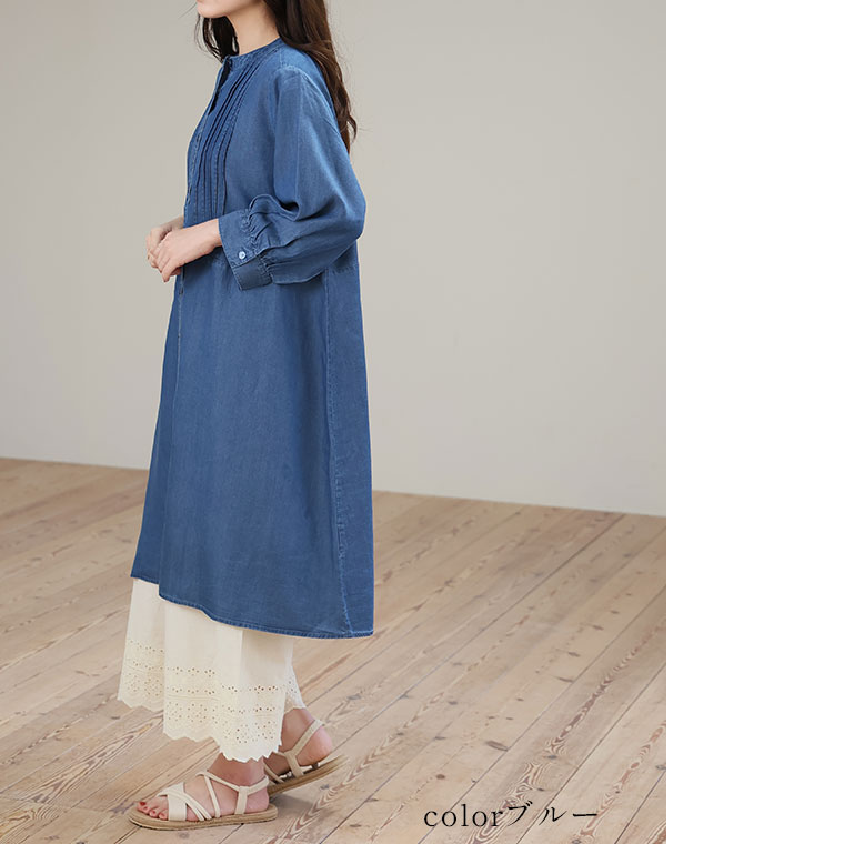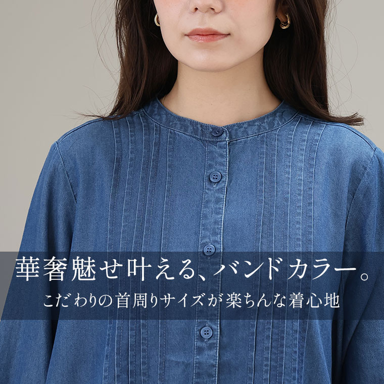 軽くて柔らか!バンドカラーピンタックデニムシャツチュニック