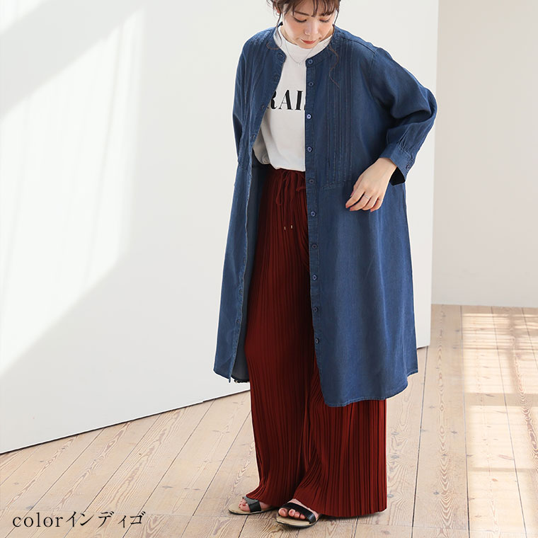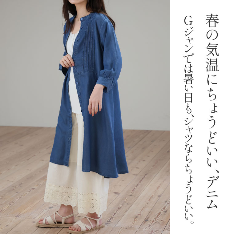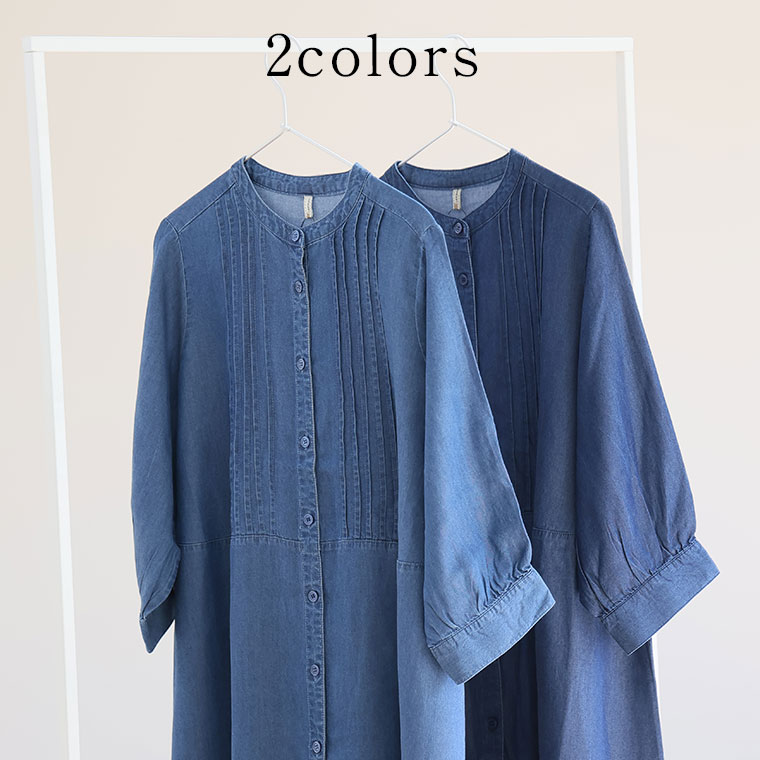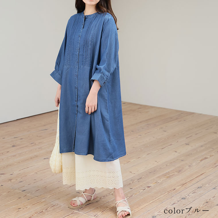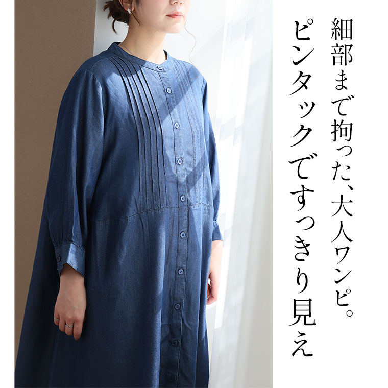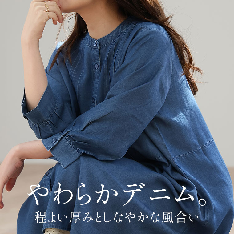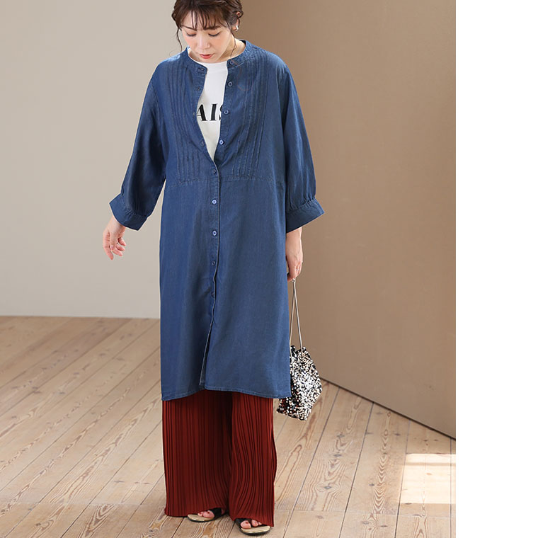 軽くて柔らか!バンドカラーピンタックデニムシャツチュニック