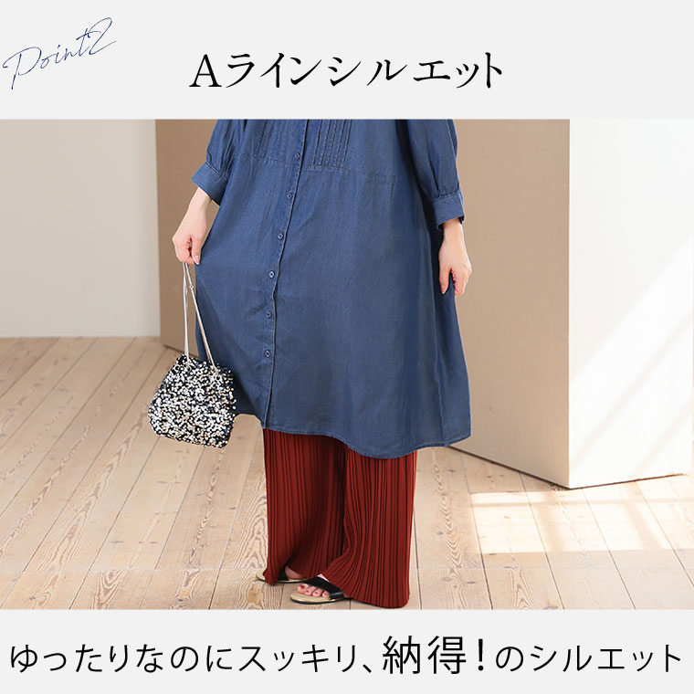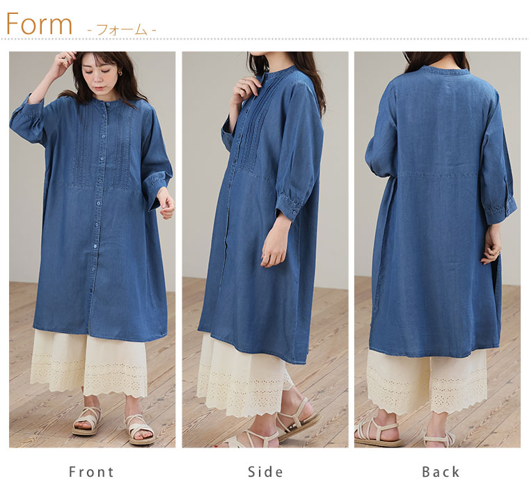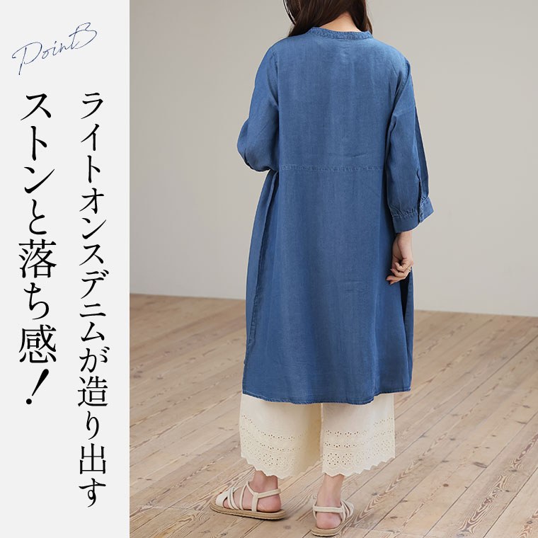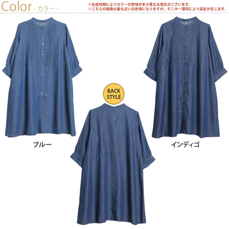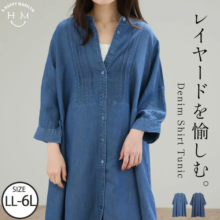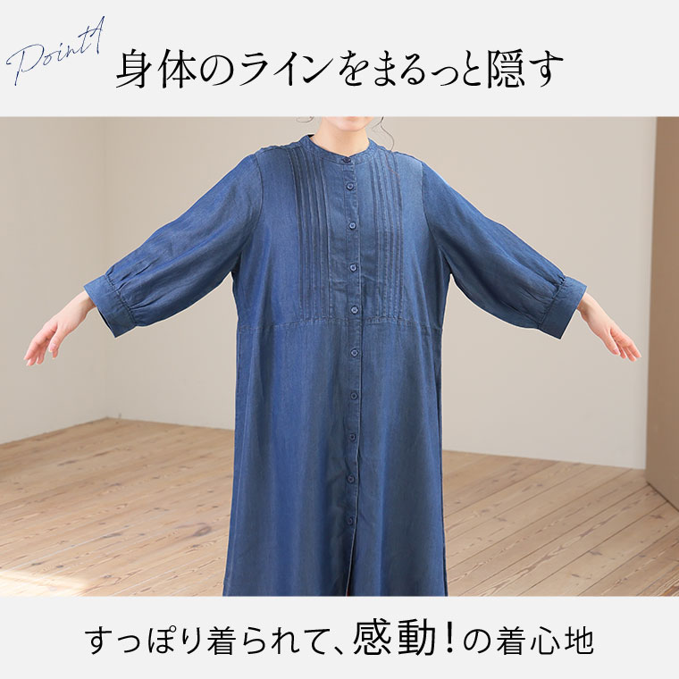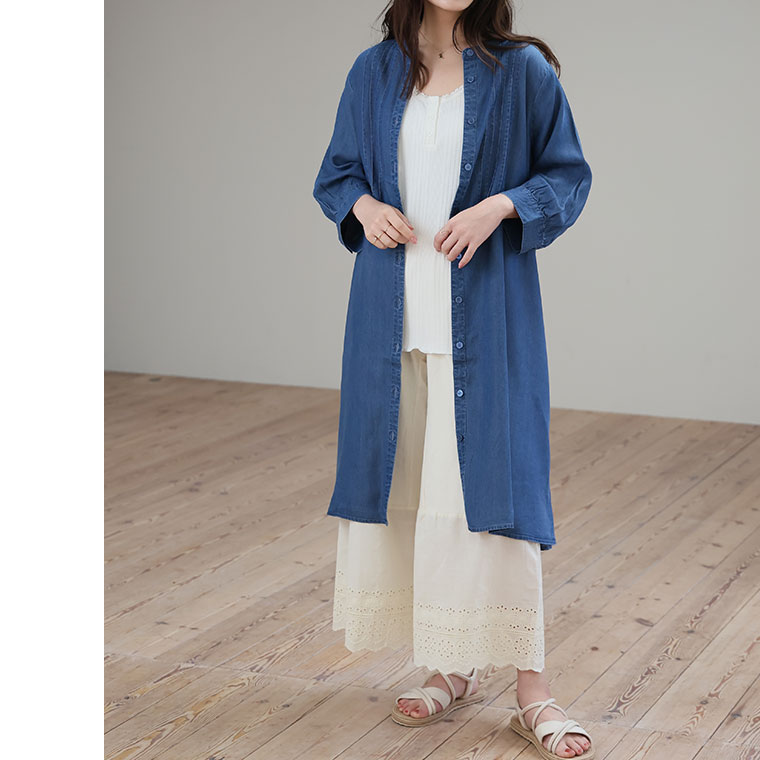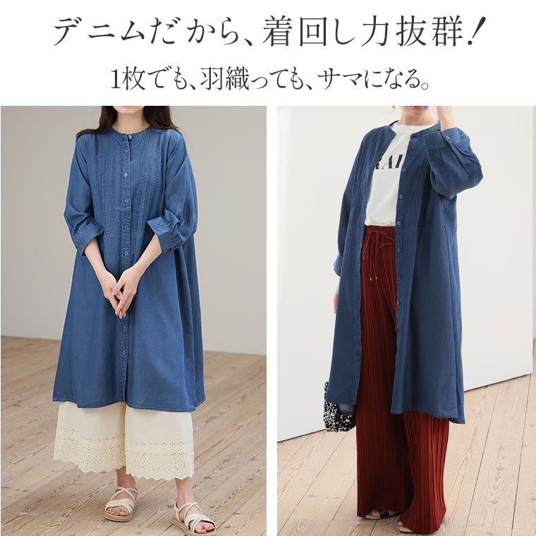 軽くて柔らか!バンドカラーピンタックデニムシャツチュニック