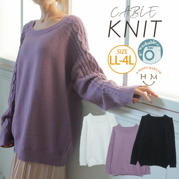 お家で洗える 袖ケーブルラグランニット