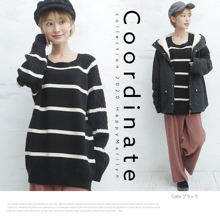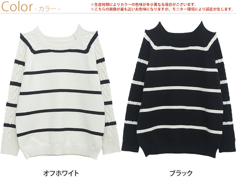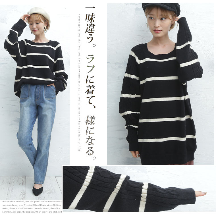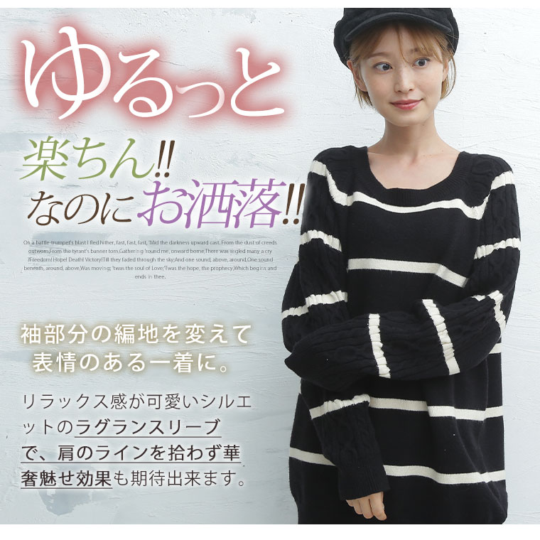 4. 大きいサイズ 袖 ケーブル ラグラン ニット シンプルボーダー