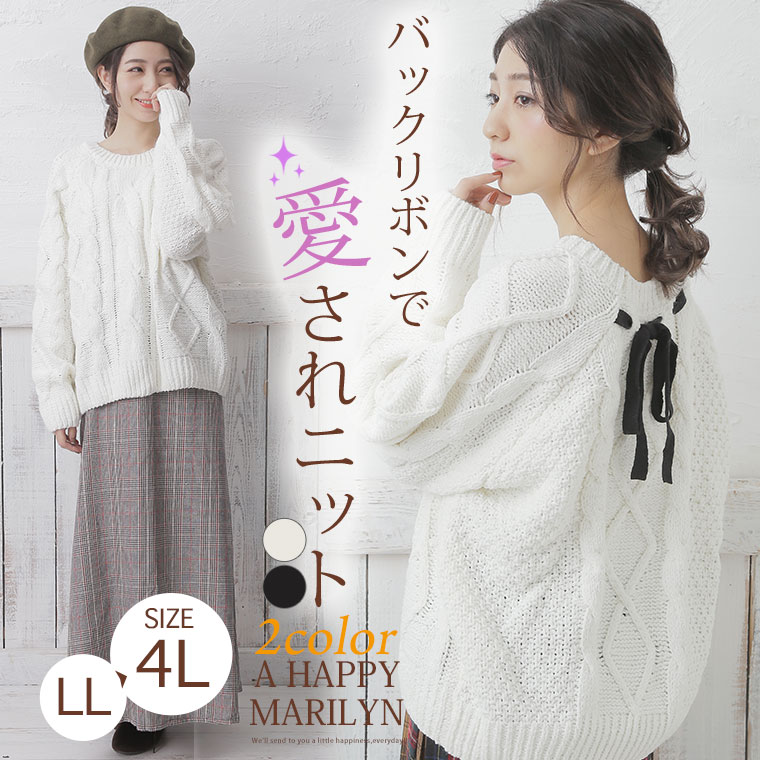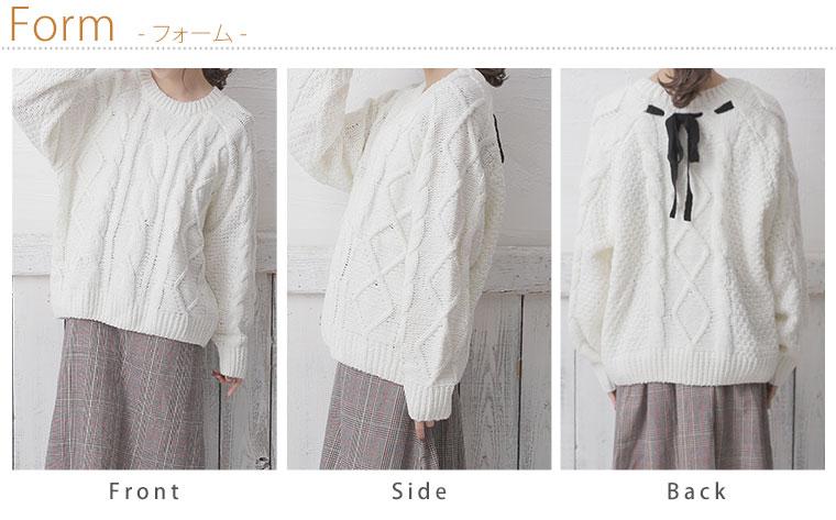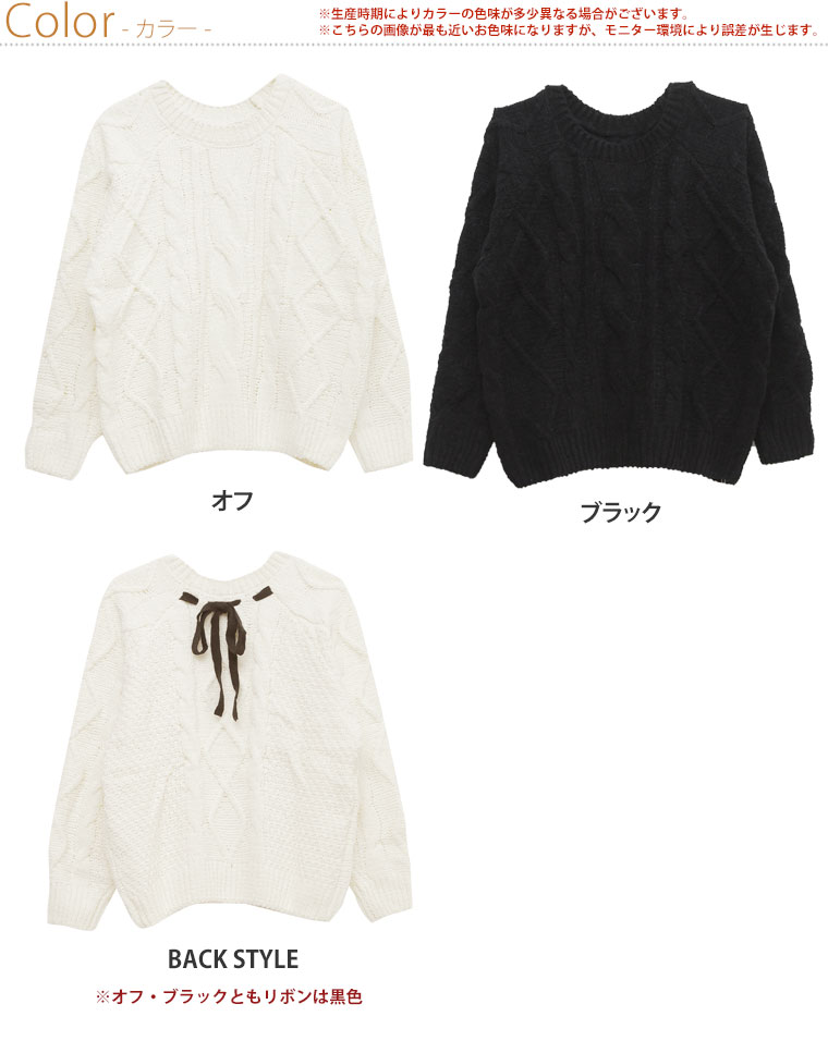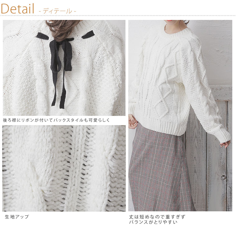後ろ襟にリボンが付いてバックスタイルも可愛らしい。ケーブルニット長袖プルオーバー