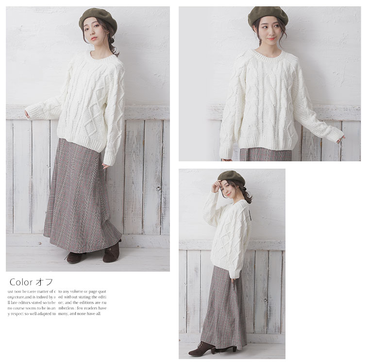 ローゲージのモール糸のケーブル編みでゆるっと着られる。