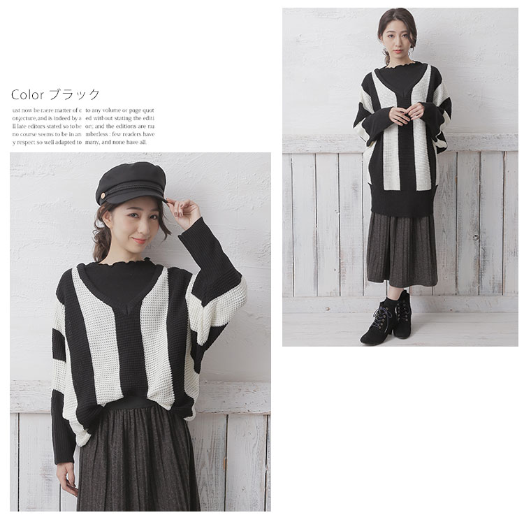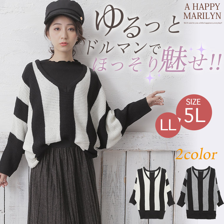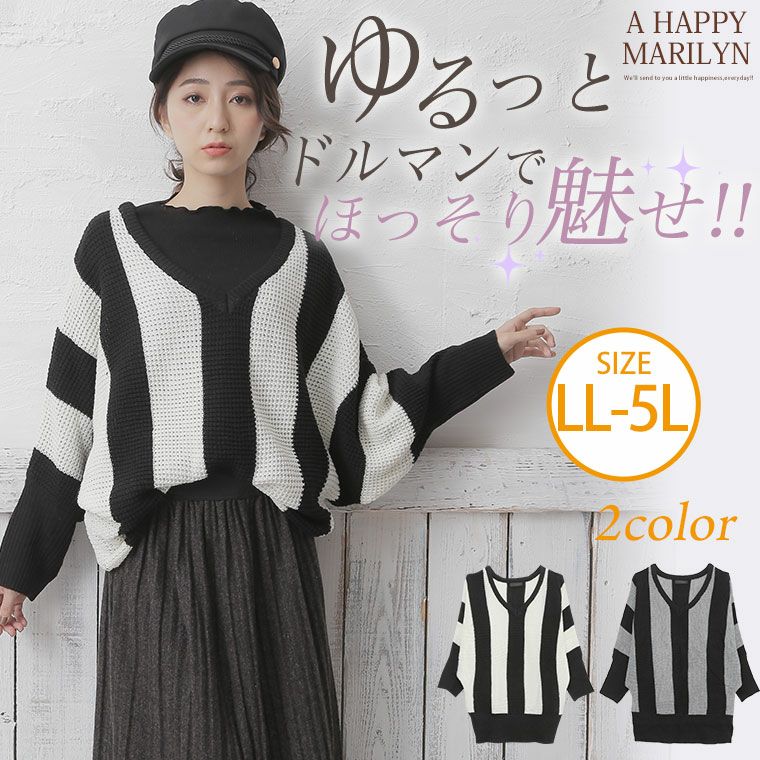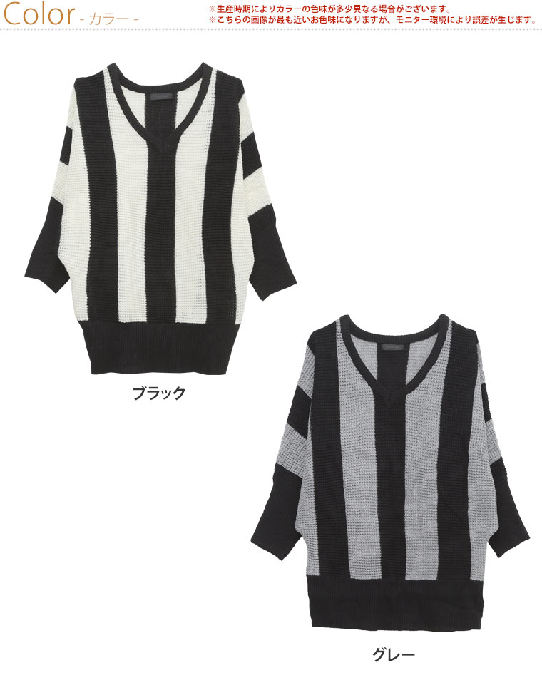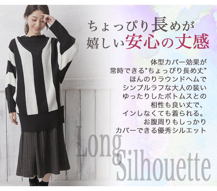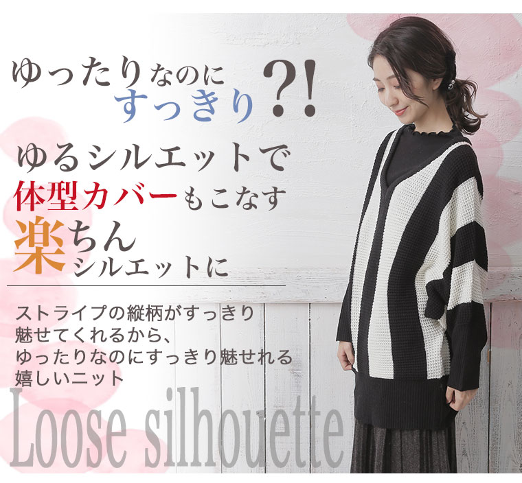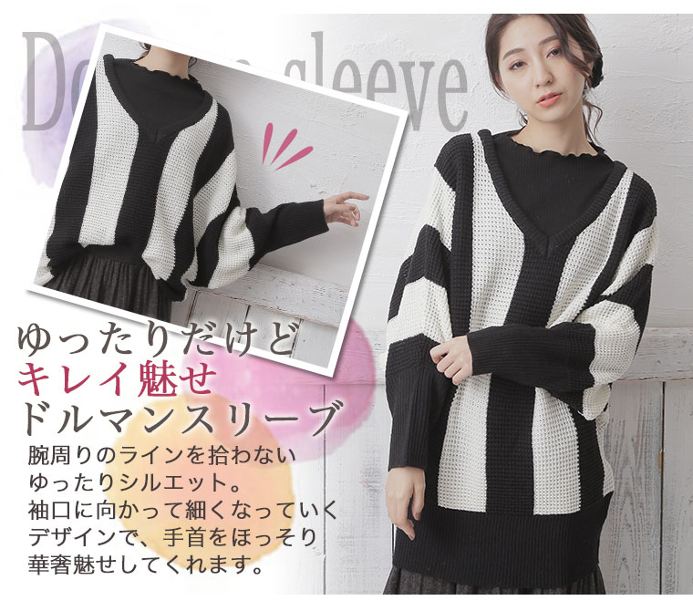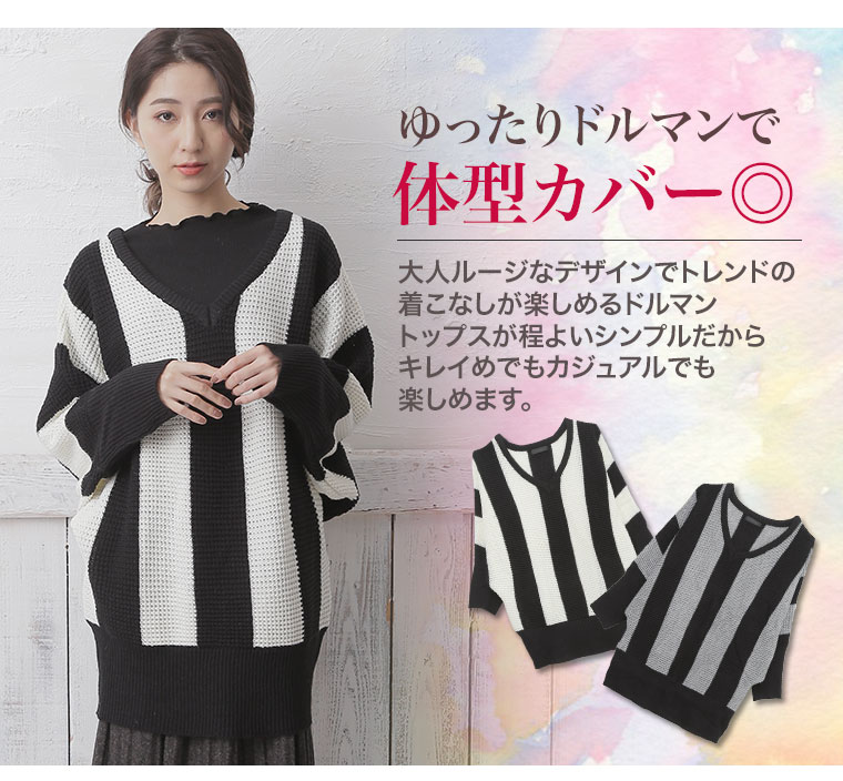 ストライプの縦見え効果で着痩せして見える。ドルマンスリーブでゆったりとした着心地