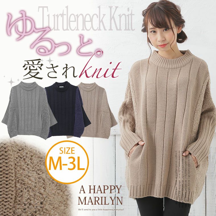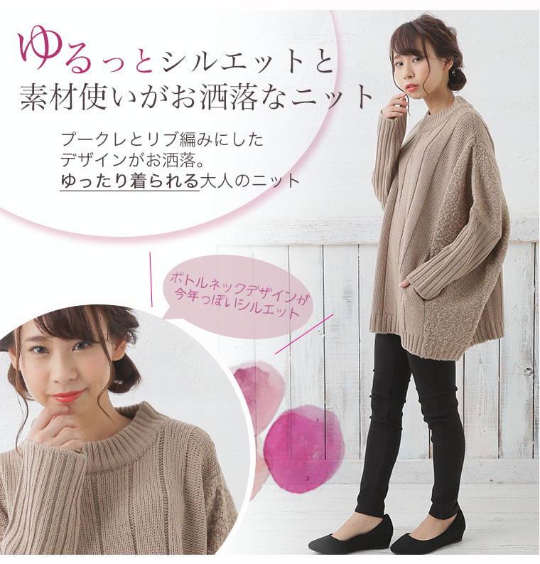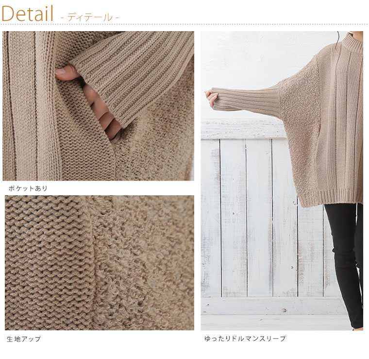 プークレ×リブ編み異素材切替ドルマンスリーブタートルネックニットプルオーバー