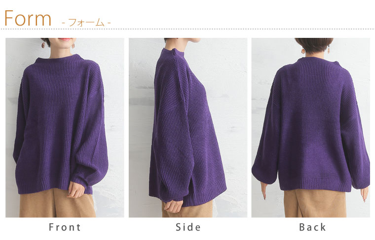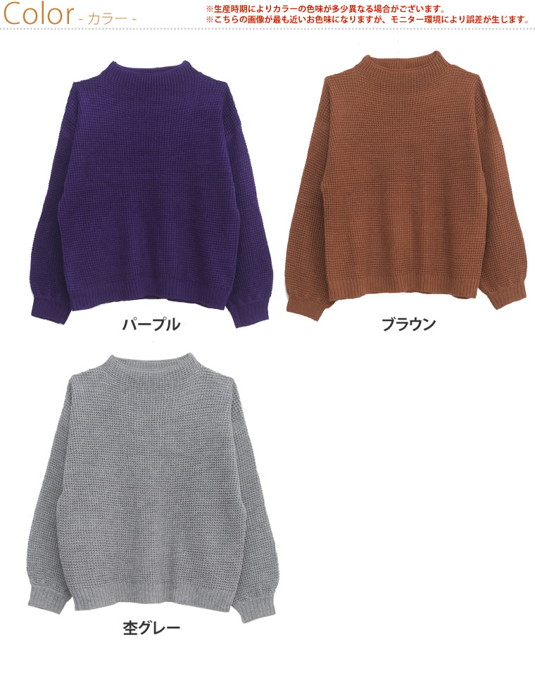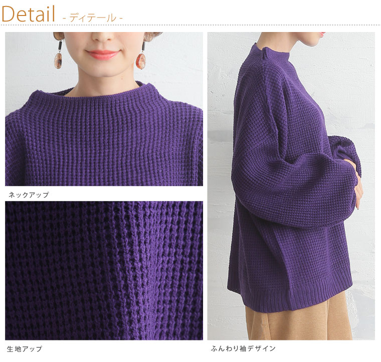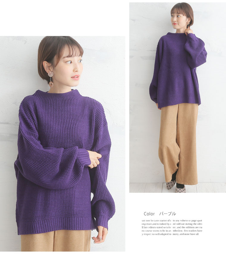 ワッフル編みでカジュアルに着こなせます。ボトルネックニットプルオーバー