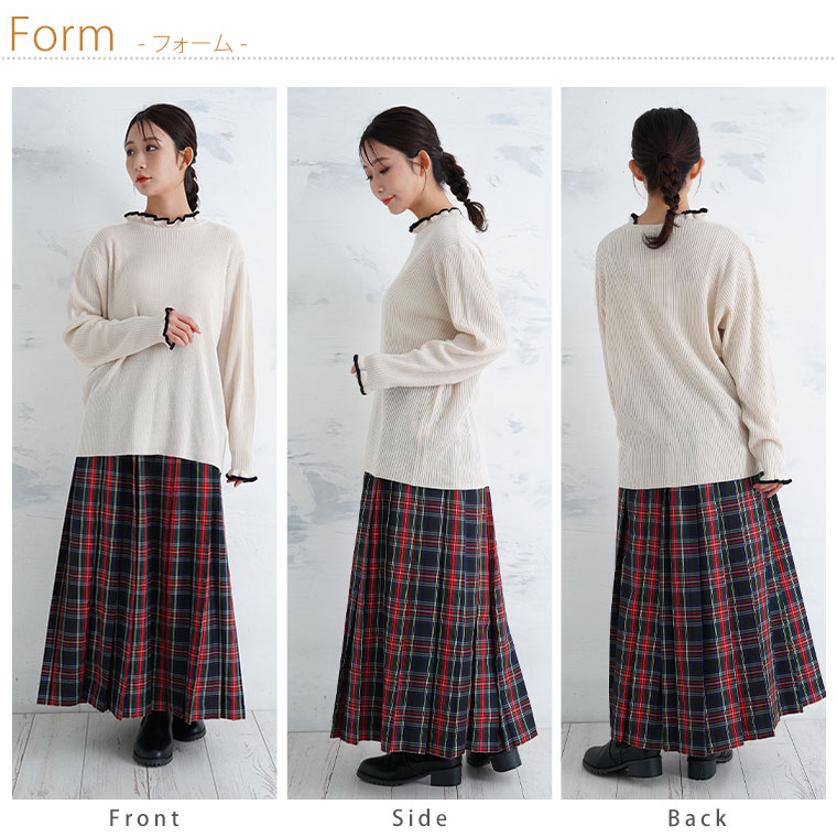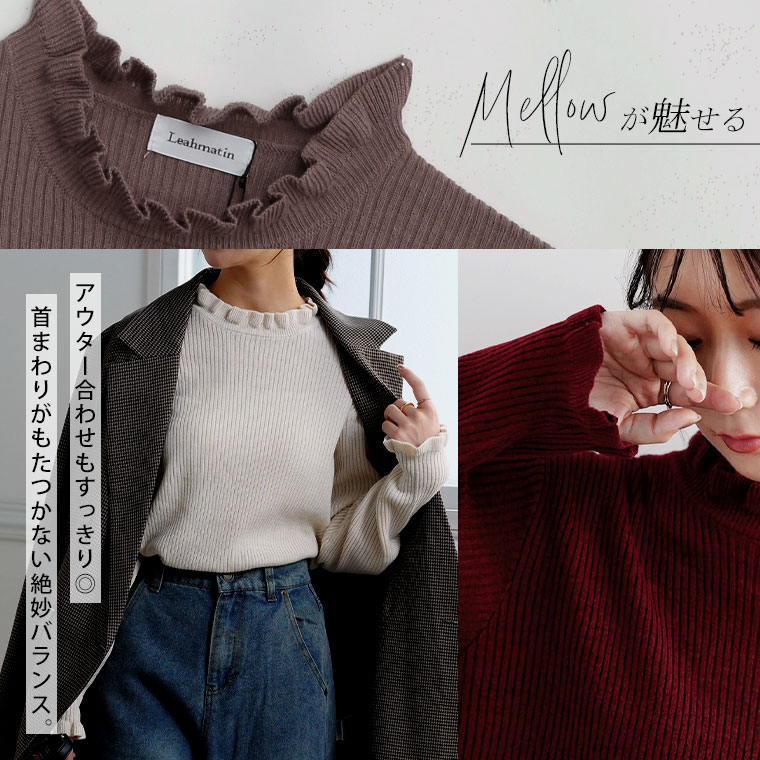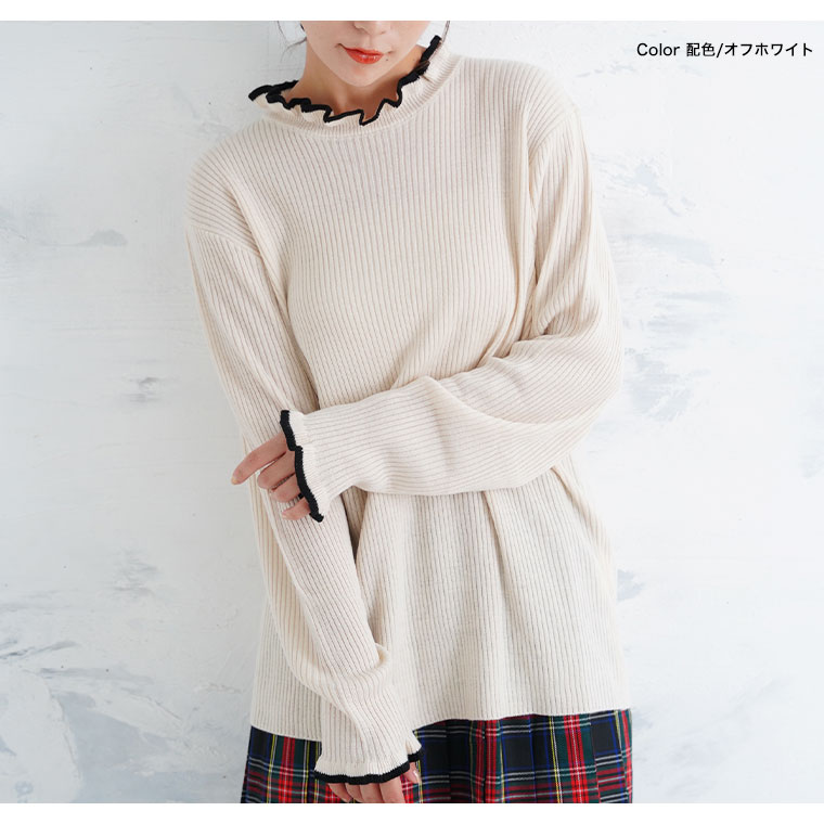 Tシャツ感覚で着られる、首元フリルのゆったりリブニット。