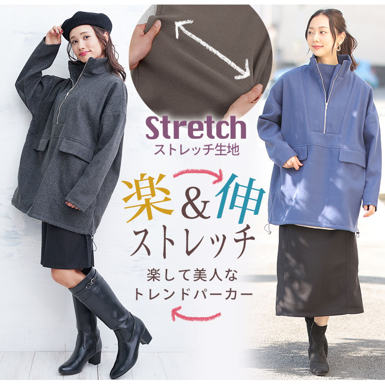 4. 大きいサイズ 楽伸びストレッチ 楽して美人な スタンドカラー フェイクウール アノラックパーカー