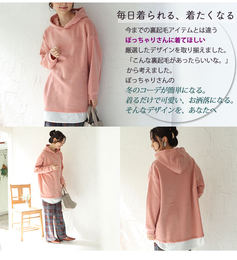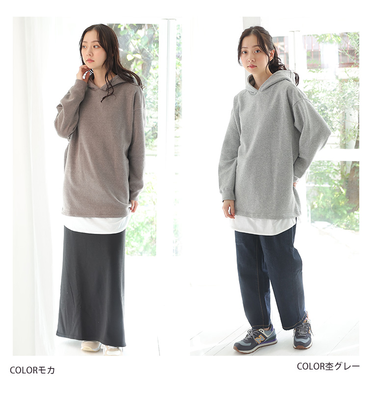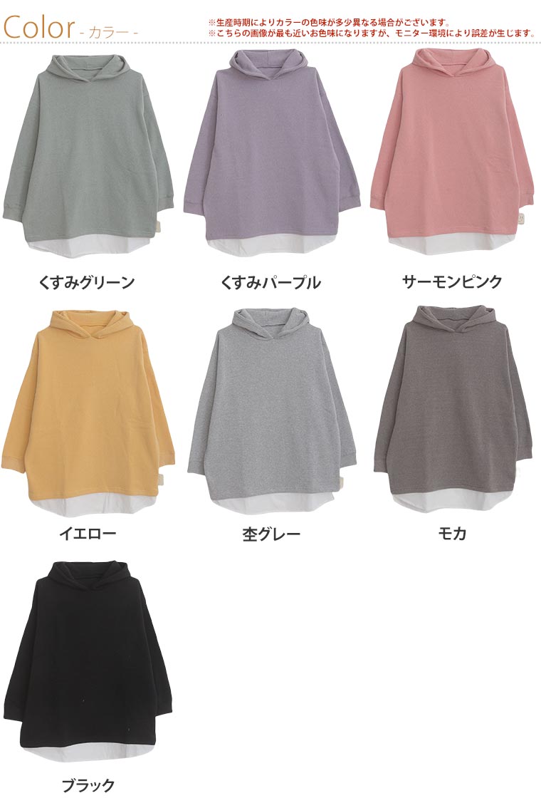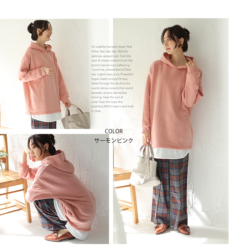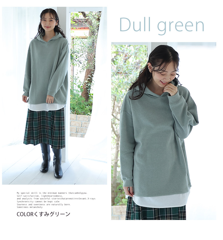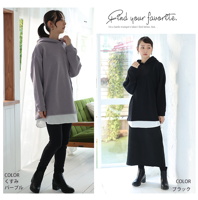 暖かくって楽に着られる 2枚重ねなくて良い裾レイヤード風パーカー