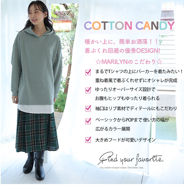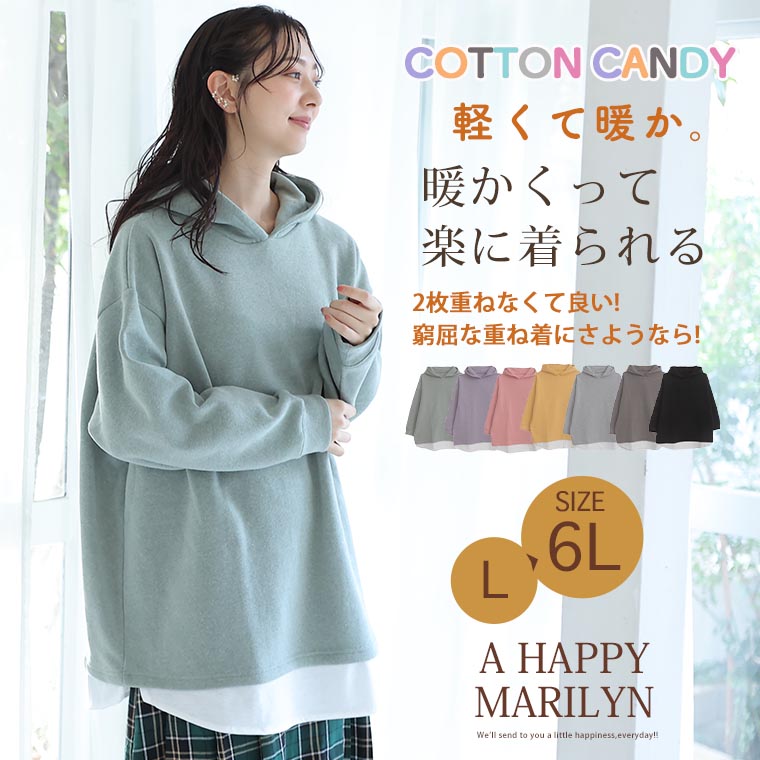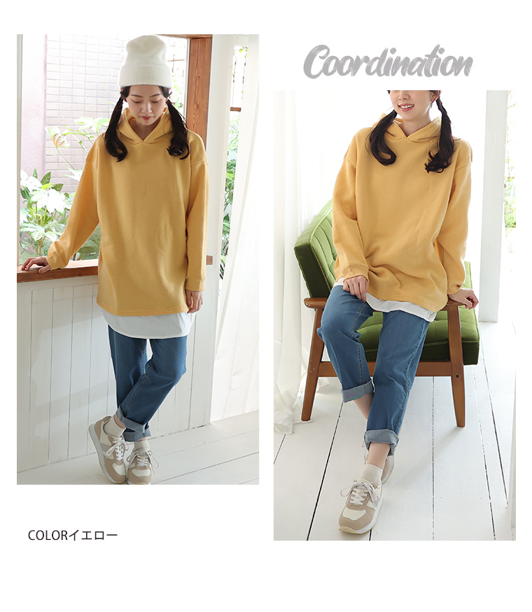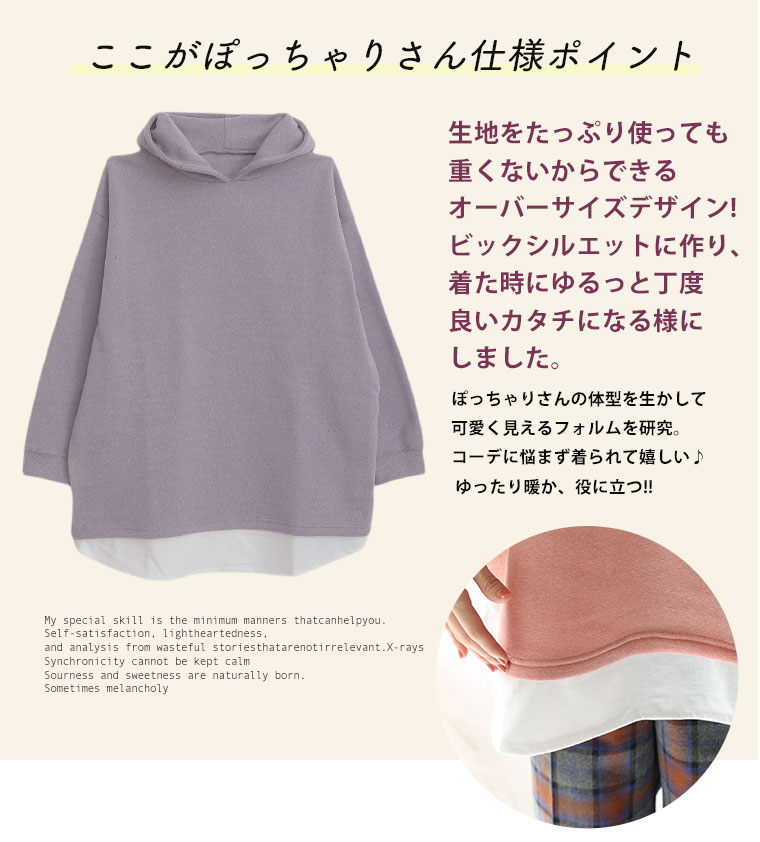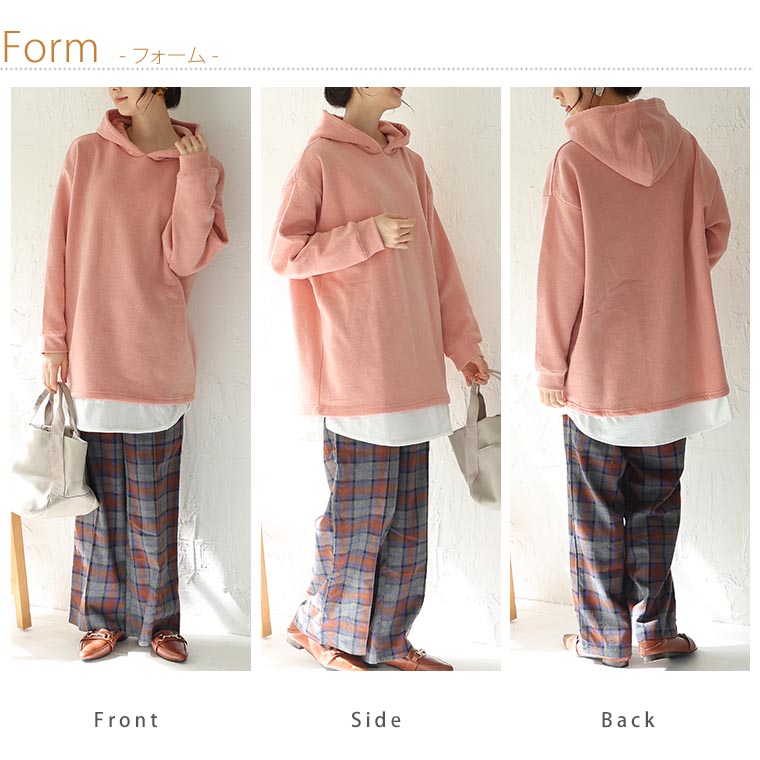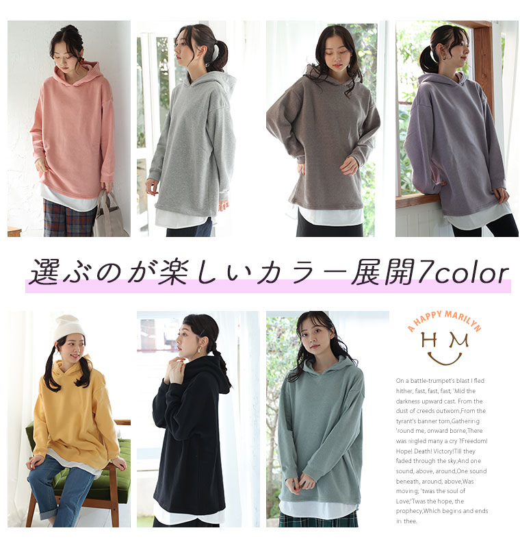 暖かくって楽に着られる 2枚重ねなくて良い裾レイヤード風パーカー