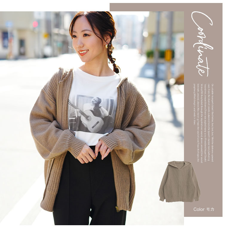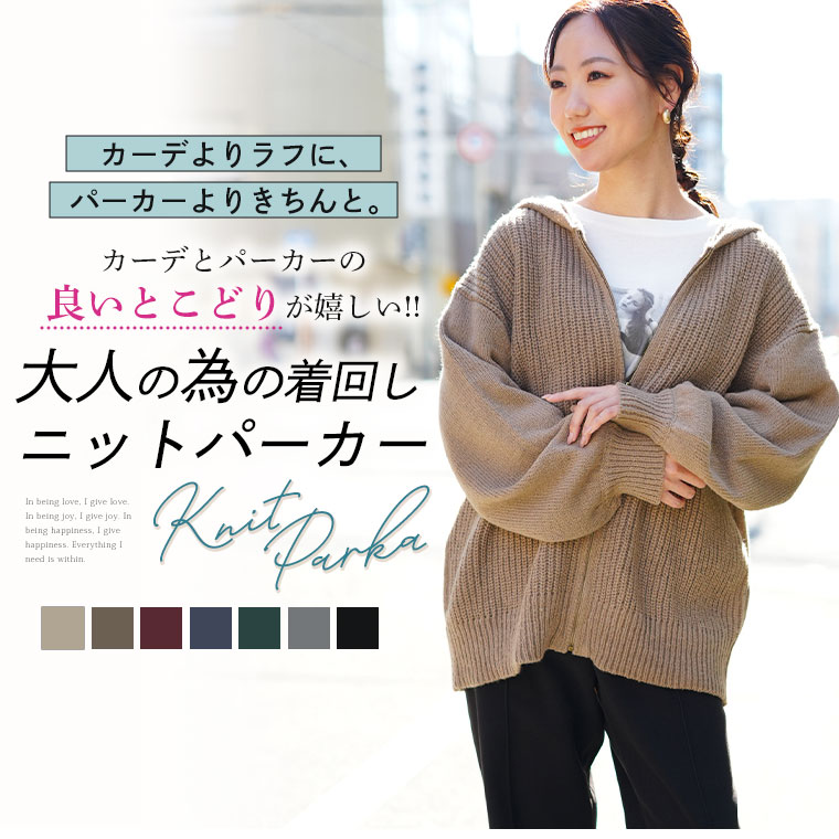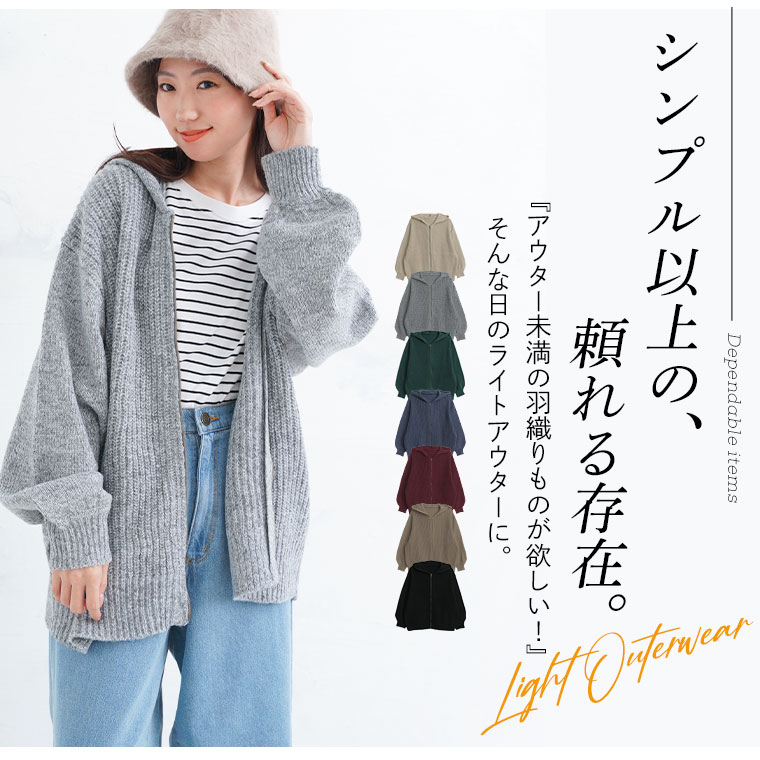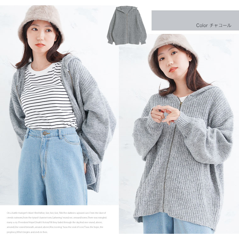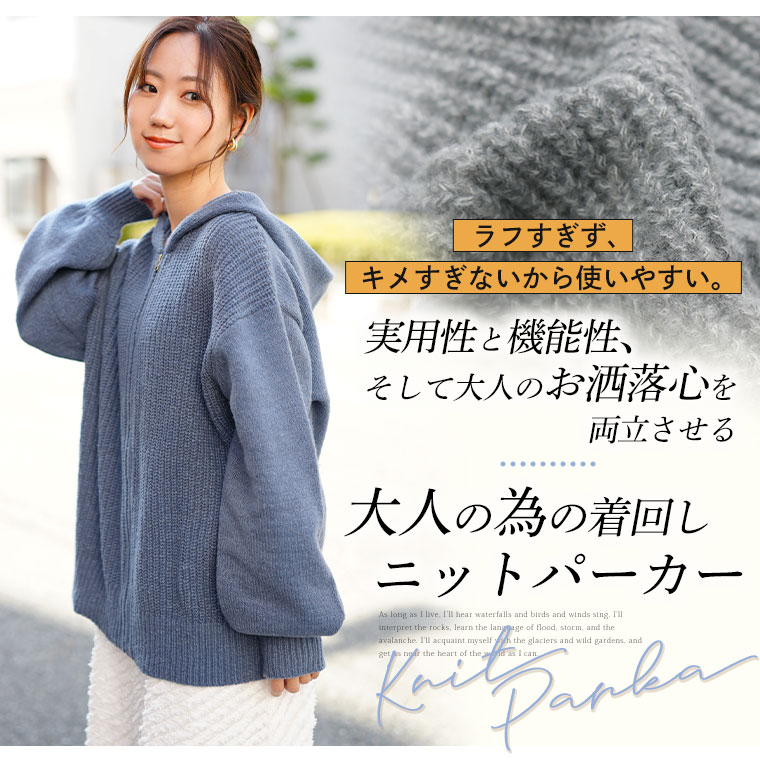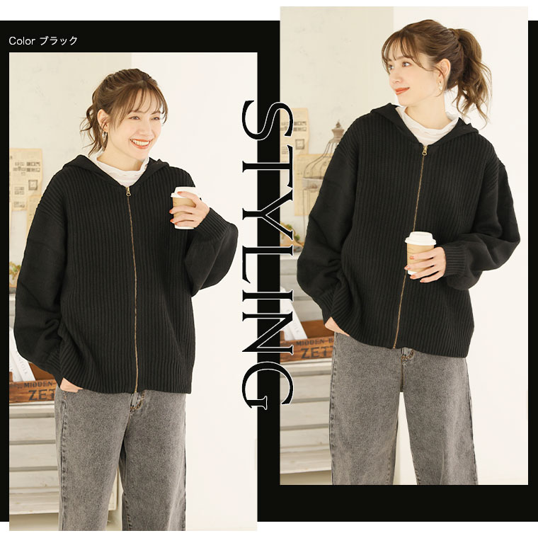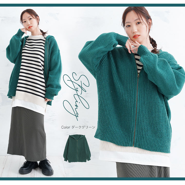 6. 大きいサイズ 編地切替え・ニット ジップパーカー
