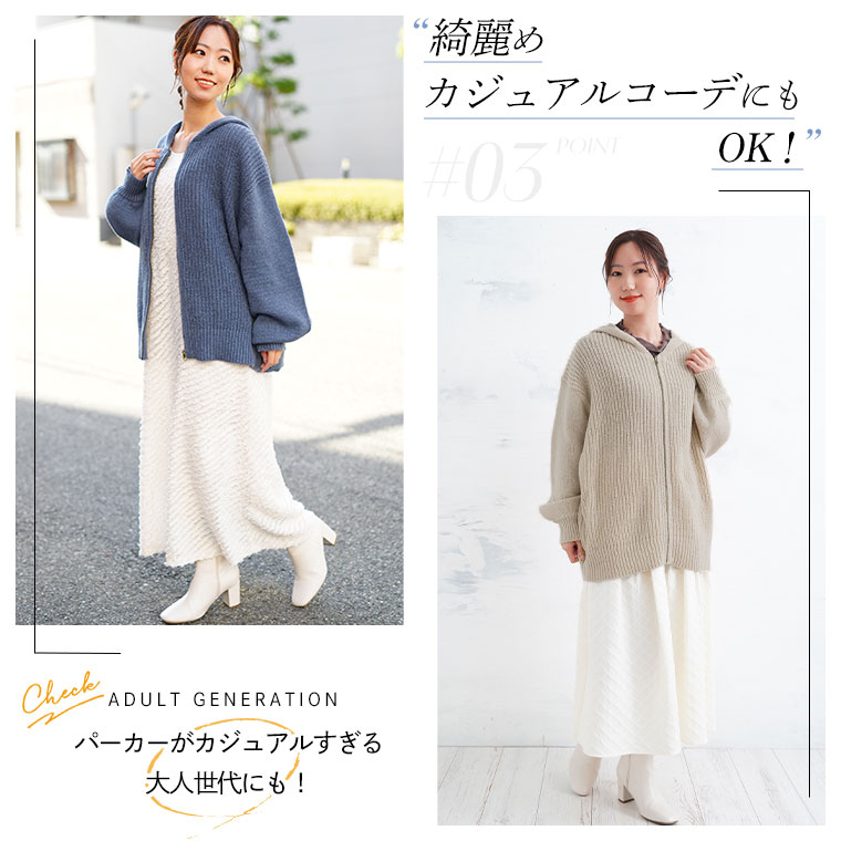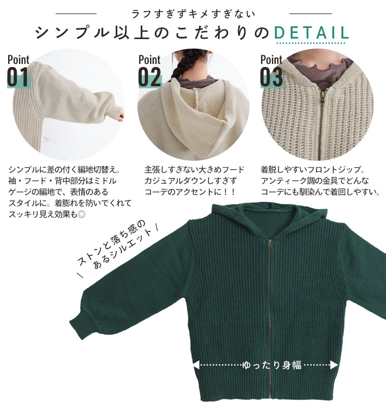 3. 大きいサイズ 編地切替え・ニット ジップパーカー