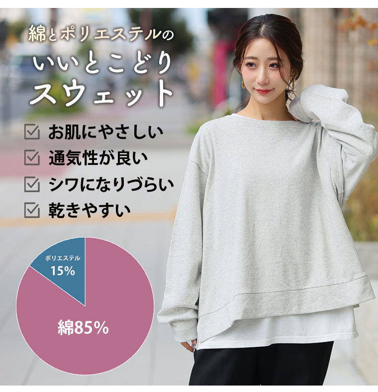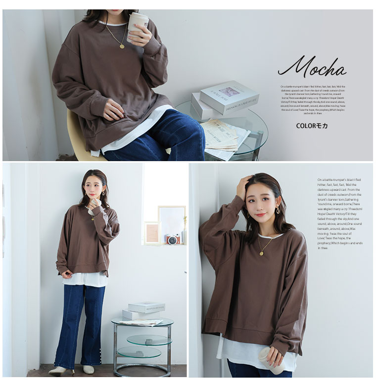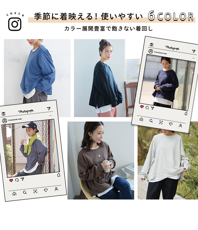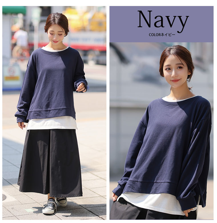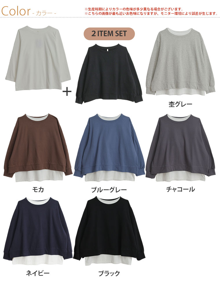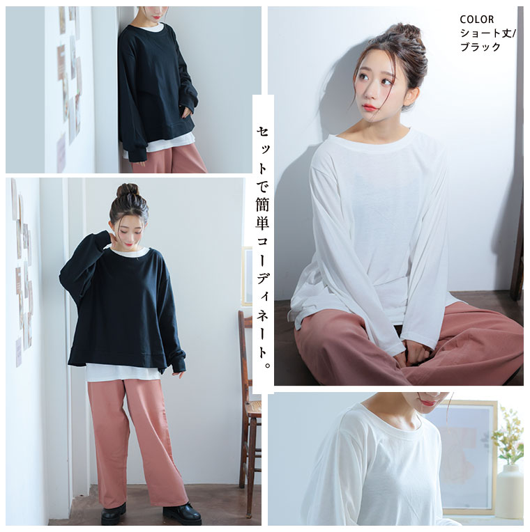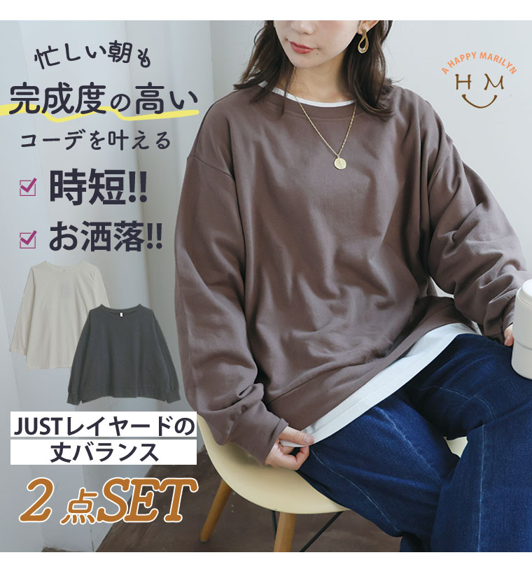 2枚セットのアンサンブル。シンプルなデザインでゆるっと着られる今季マストのベーシックトップス。何にでも合わせられるのが◎